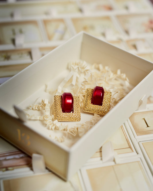 Orecchini anni 80 dorati con vetro resina rosso