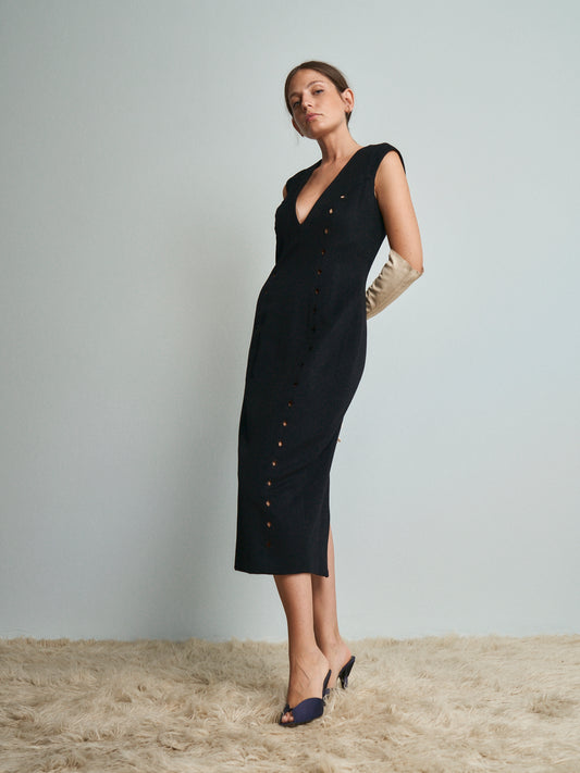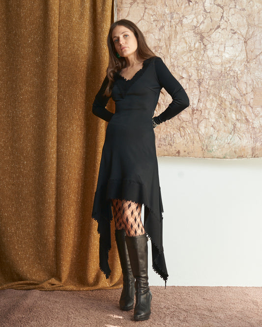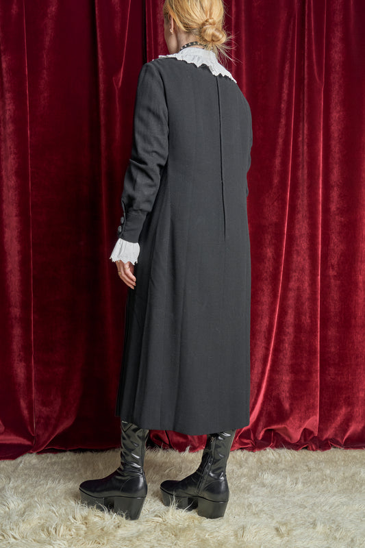 Abito anni 60 nero in seta con tessuto manipolato a mano, collo americano