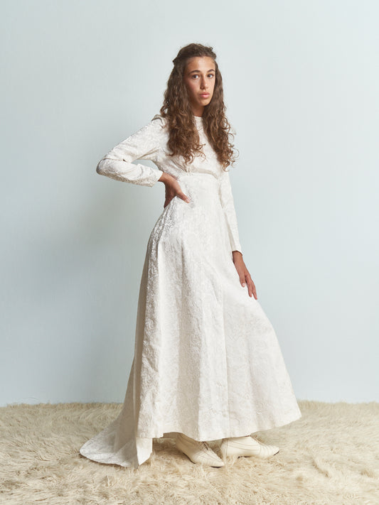 Abito da Sposa fine anni 50 in broccato bianco con rose applicate