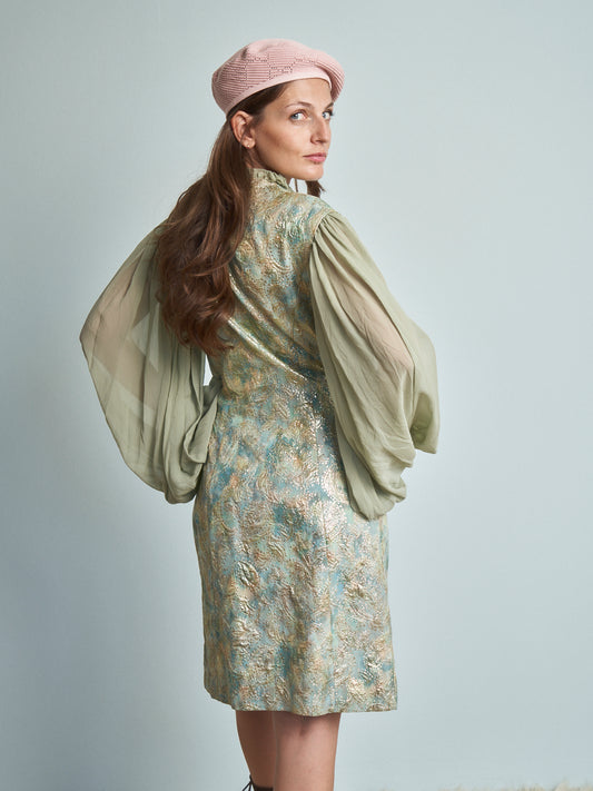 Abito anni 60 lurex broccato e seta verde salvia azzurro e oro