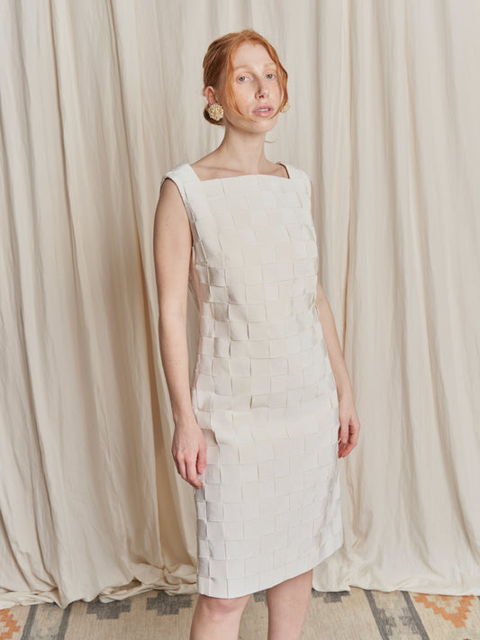Abito bianco anni 60 sartoriale in gros grain intrecciato a mano.