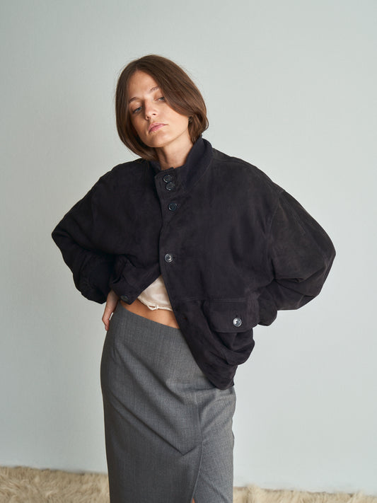Bomber in camoscio blu con costina in lana al fondo modello maschile