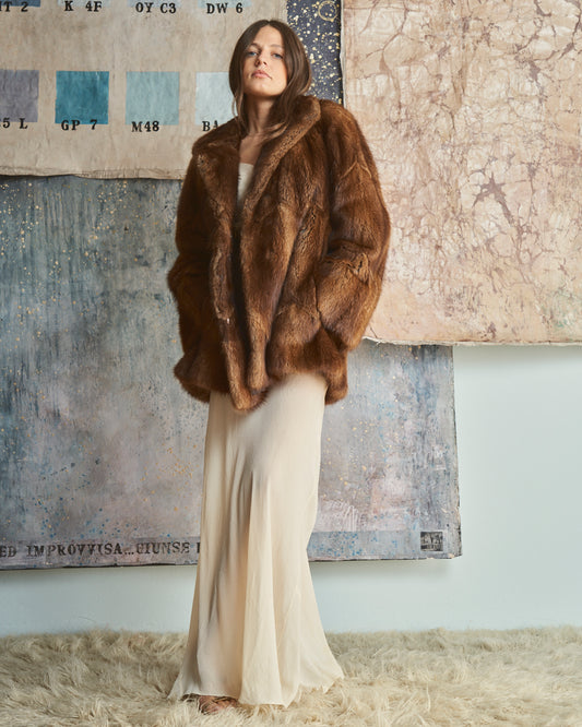 Pelliccia in visone corta svasata con motivi a V