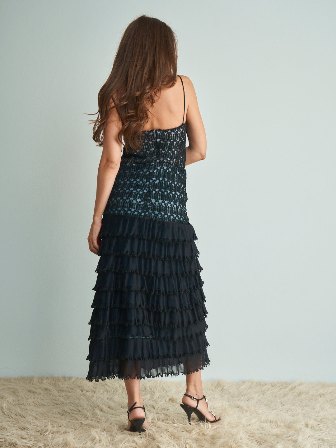 Abito anni 80 con balze plissettate e pizzo macramé.