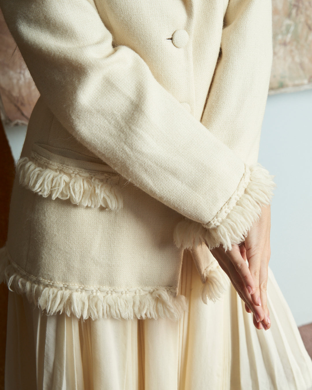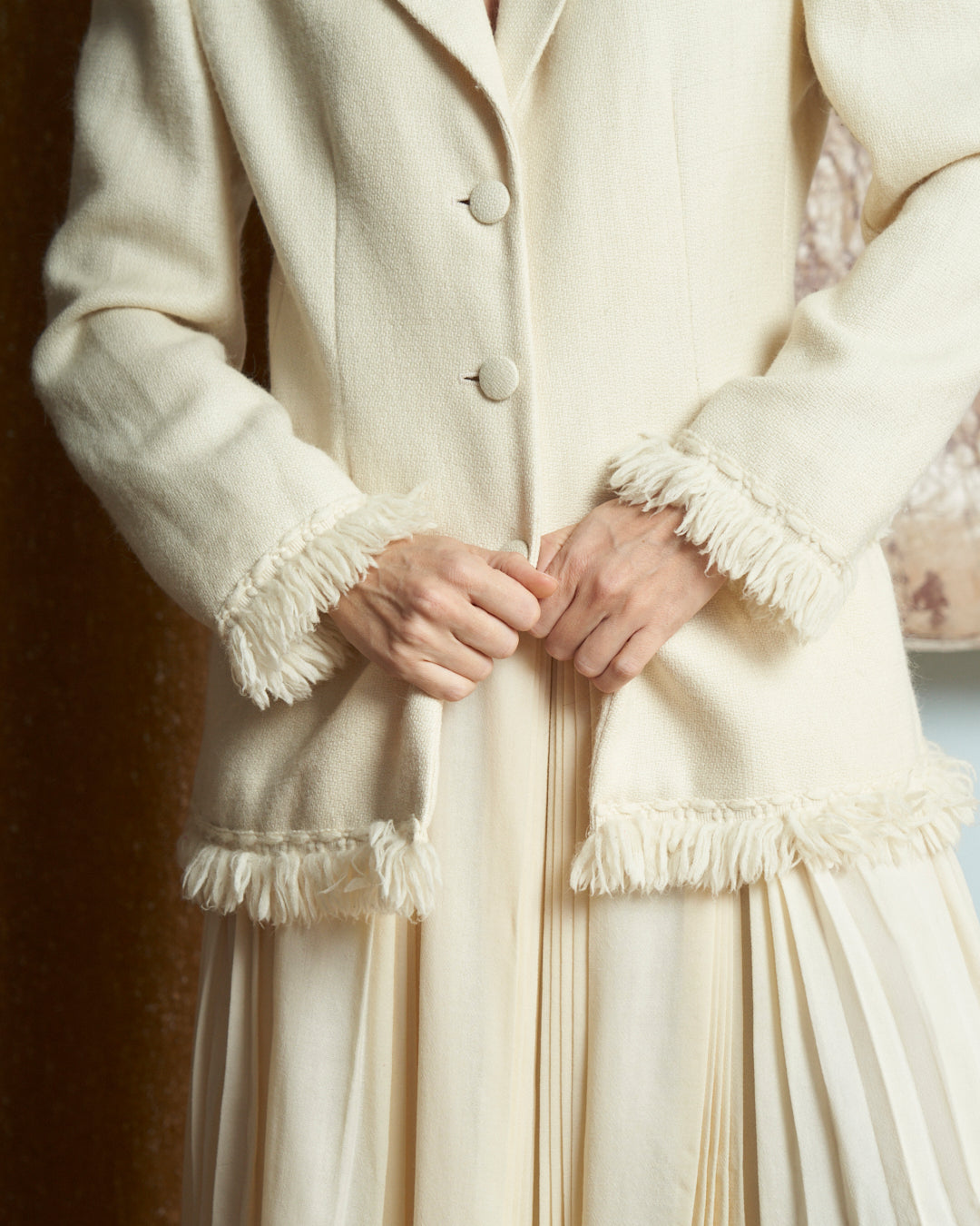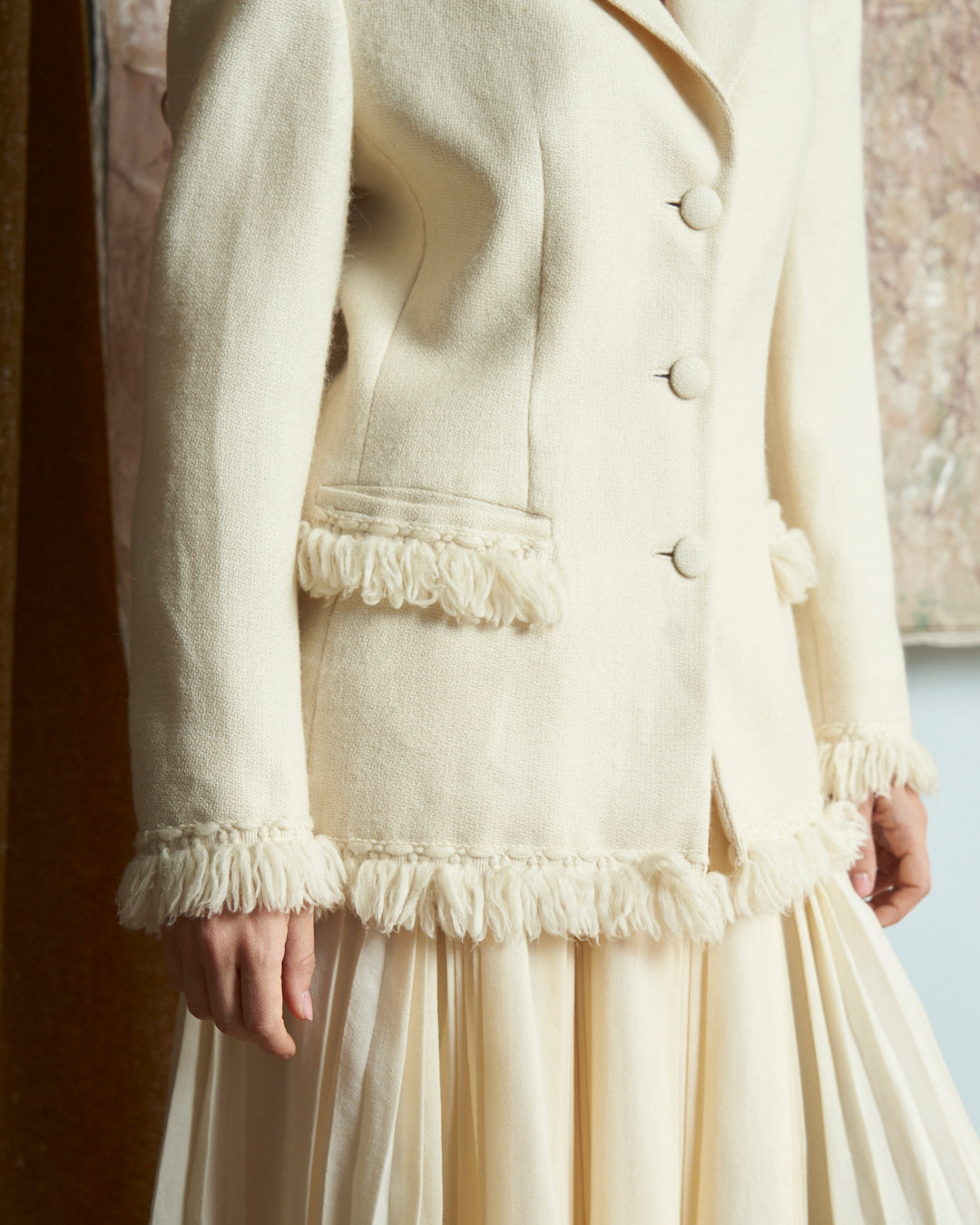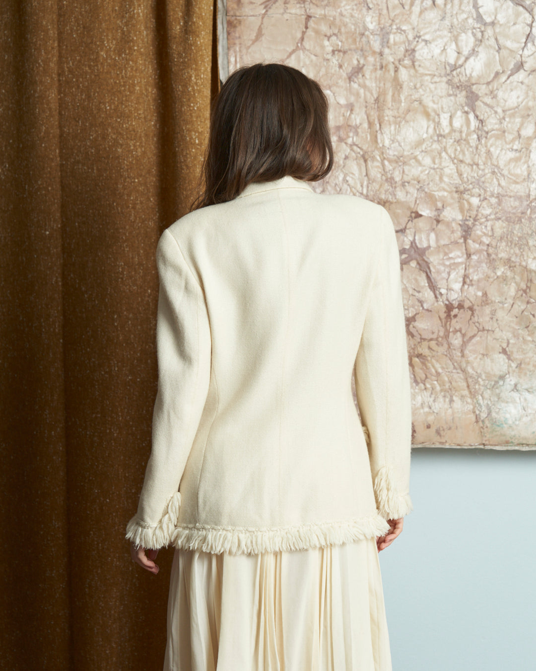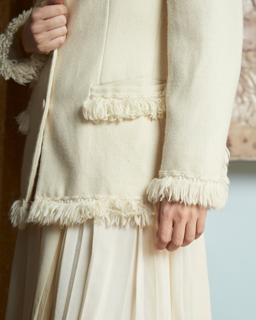 Giacca in lana fibra lunga non pettinata, con profili frangette passamaneria ton sur ton