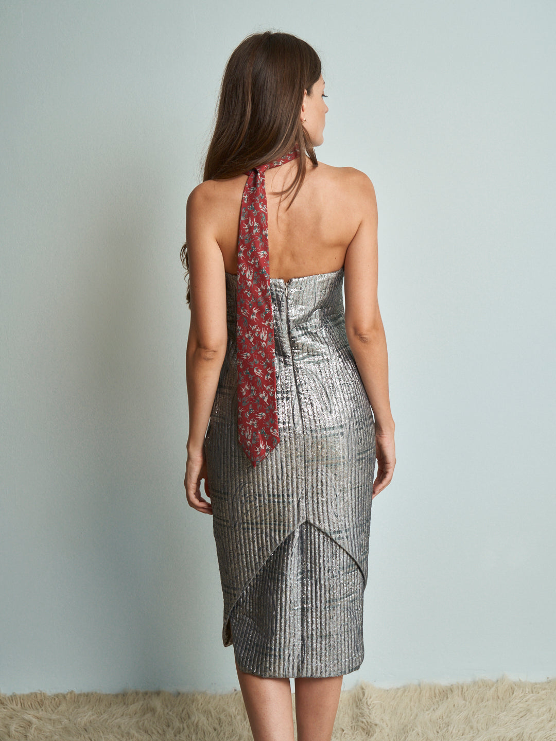 Abito Antonio Berardi in tessuto laminato argento matelassé senza spalline