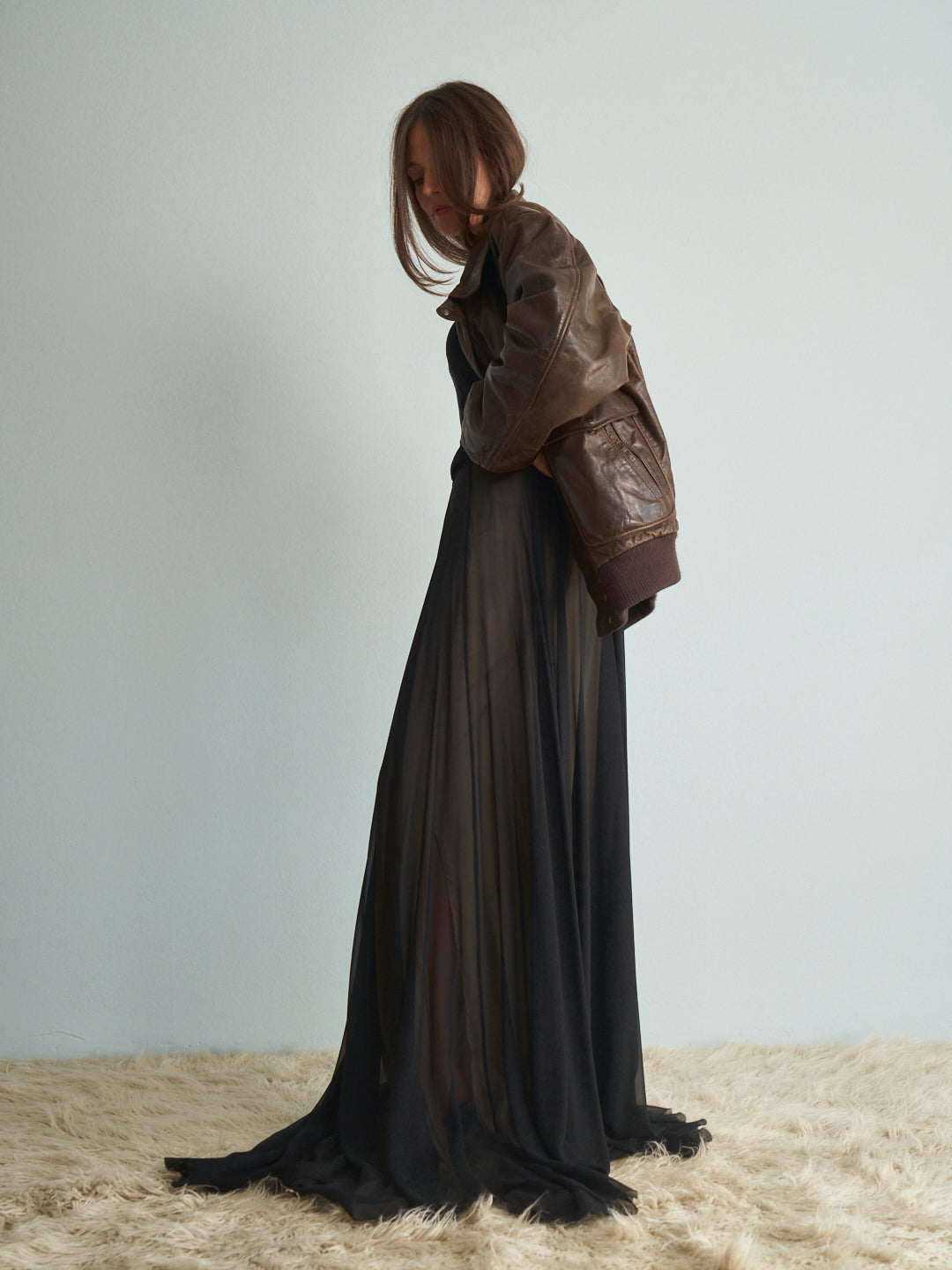 Bomber pelle marrone testa di moro con chiusura zip davanti e collo giubbotto, fondo e maniche con costine.