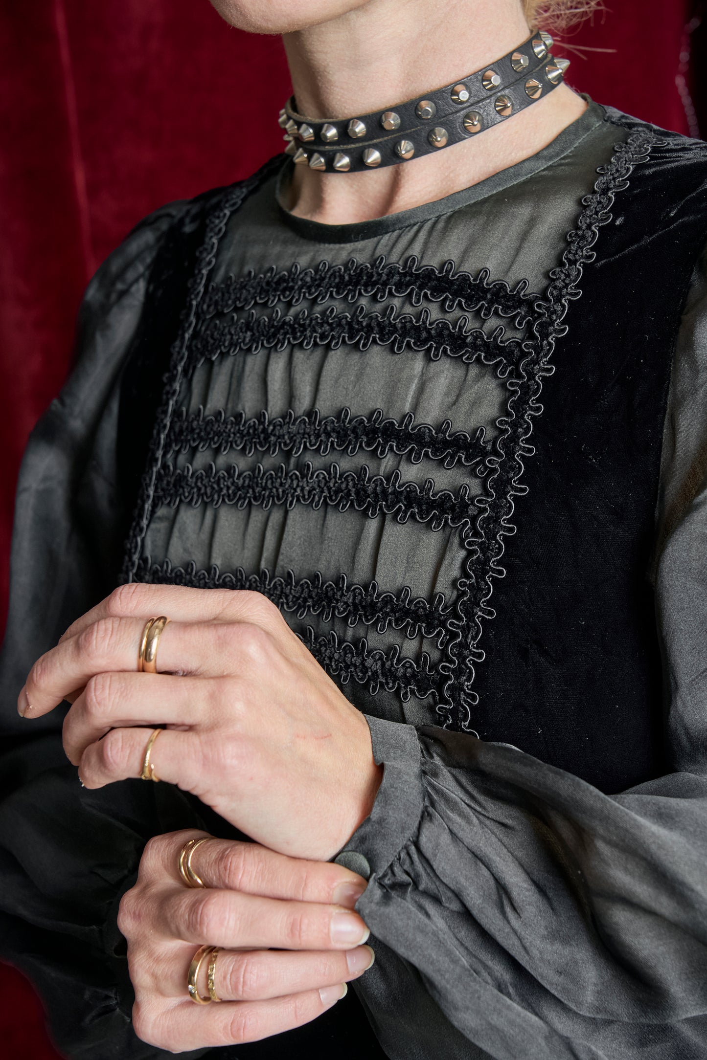 Magnifico abito anni 70 in velluto di seta e organza di seta, foderato, con pettorina davanti a passamaneria e maniche a sbuffo.