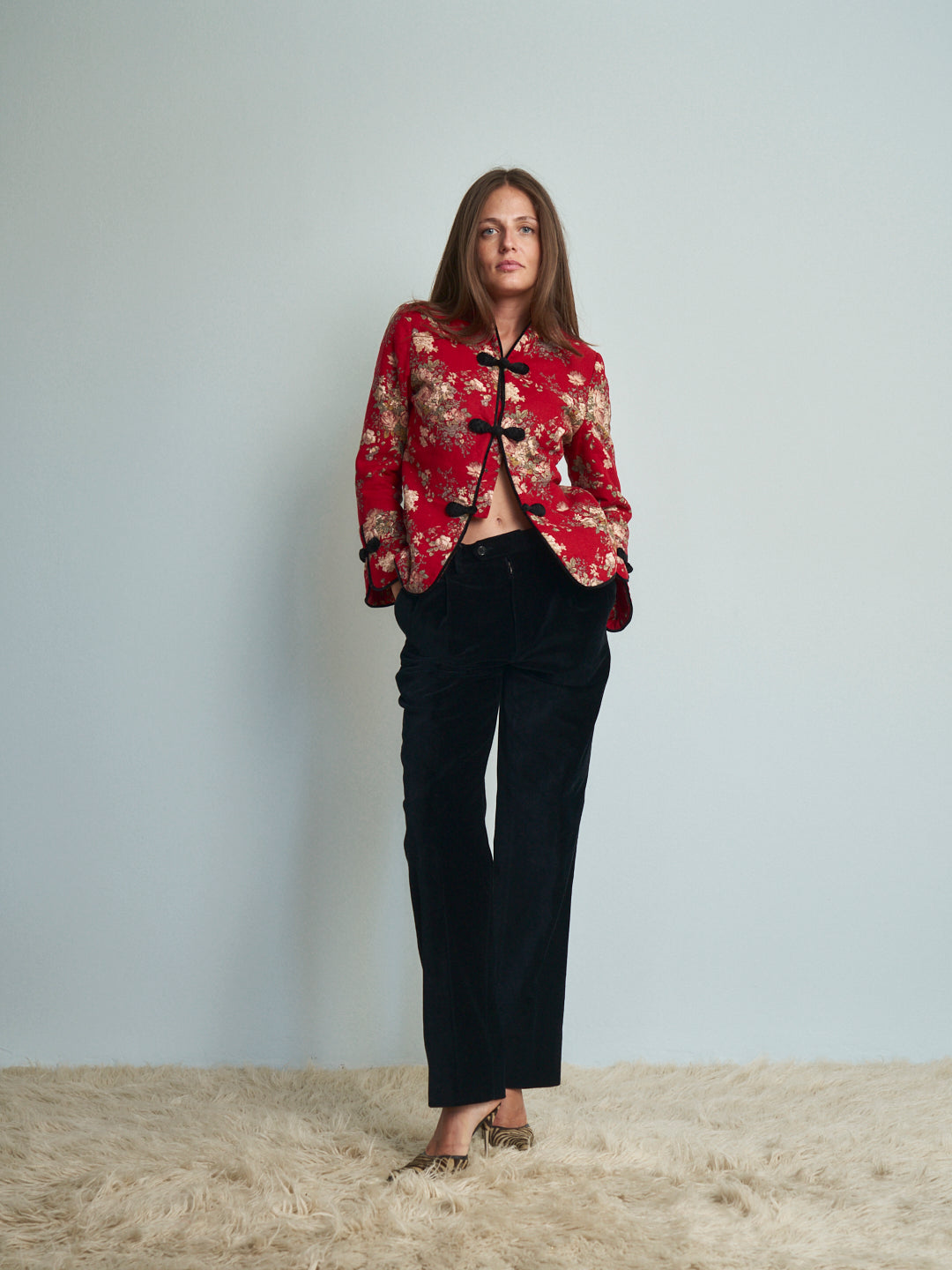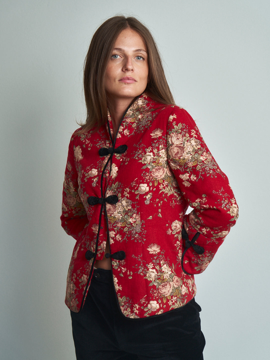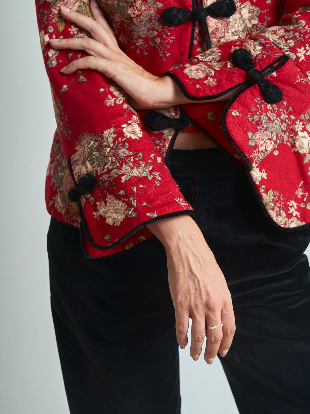 Giacca rossa modello asiatico rossa imbottita con inserti neri in velluto e alamari in velluto ciniglia