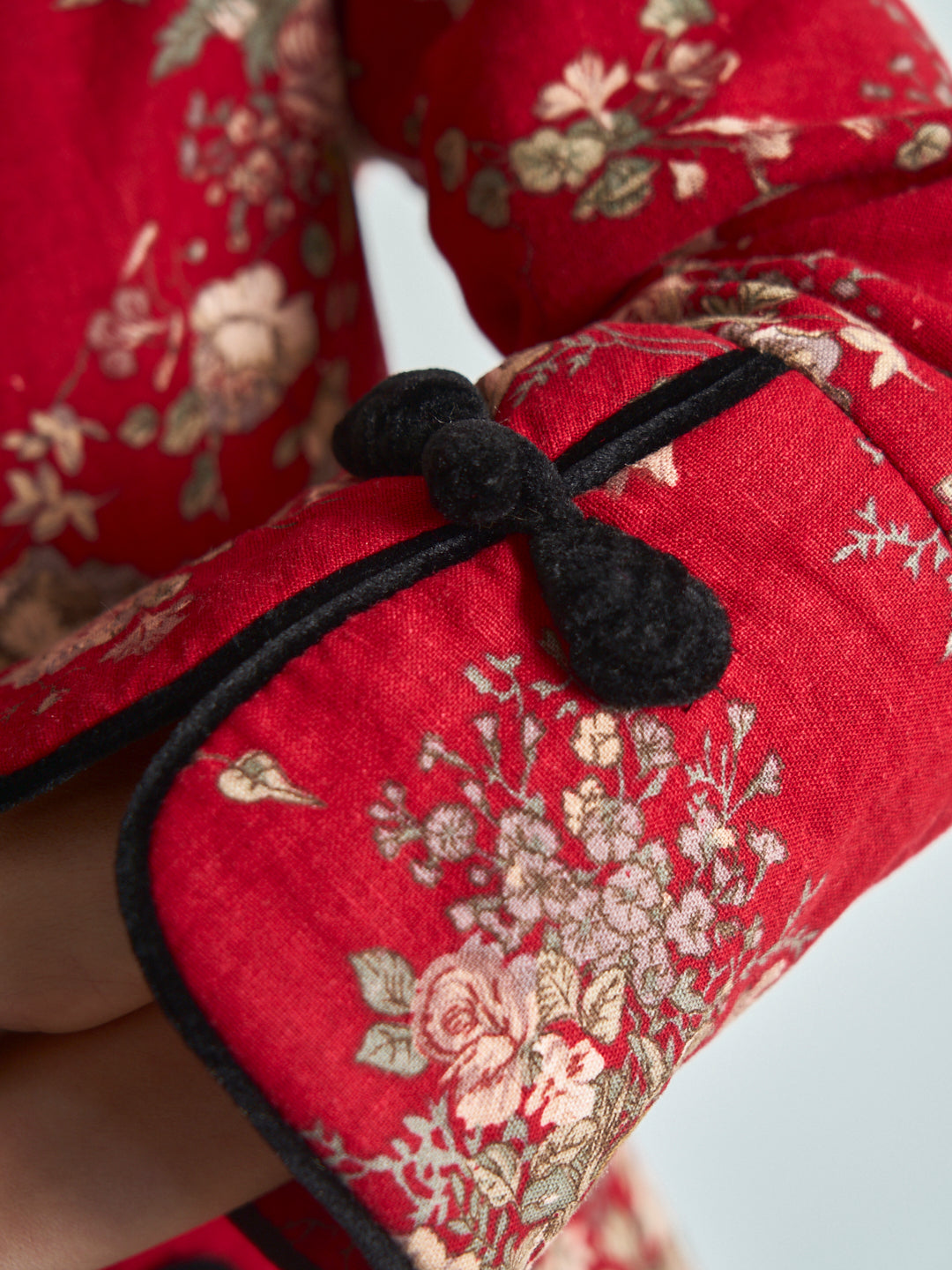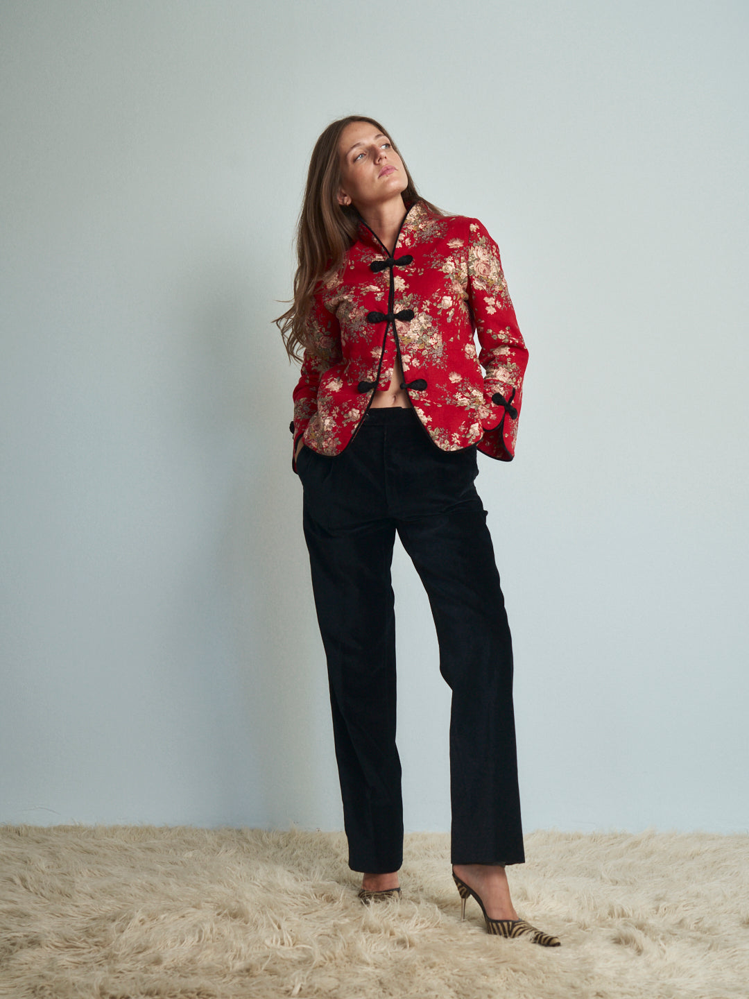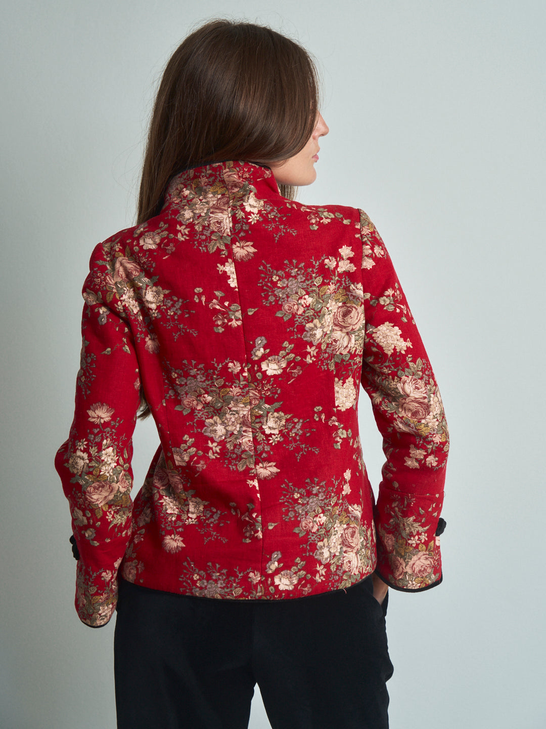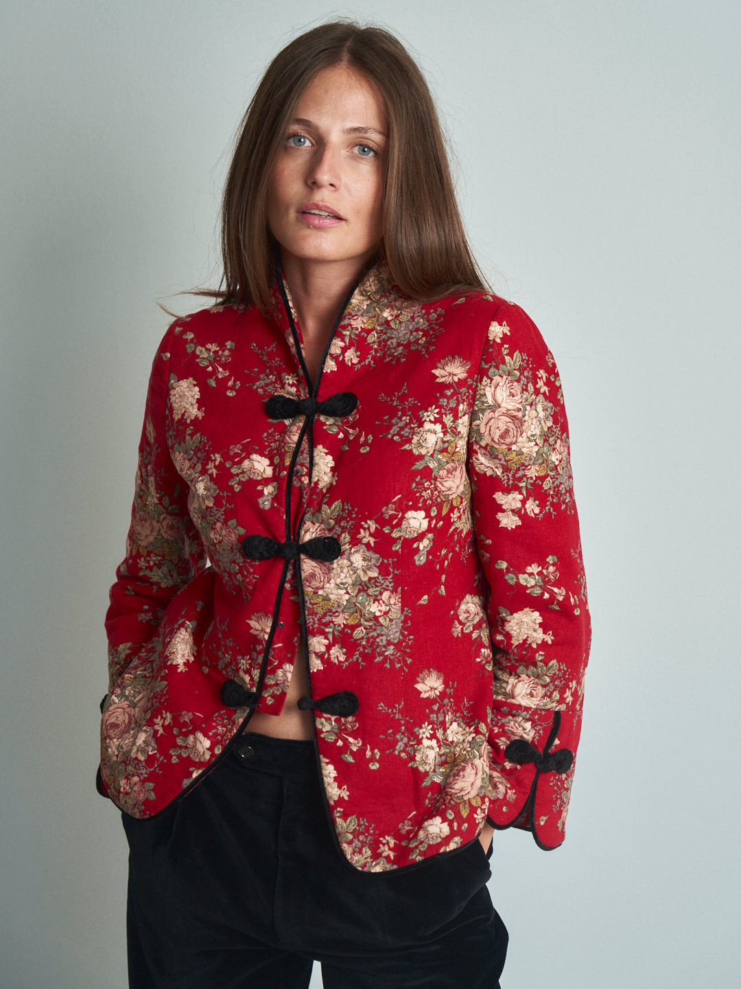 Giacca rossa modello asiatico rossa imbottita con inserti neri in velluto e alamari in velluto ciniglia