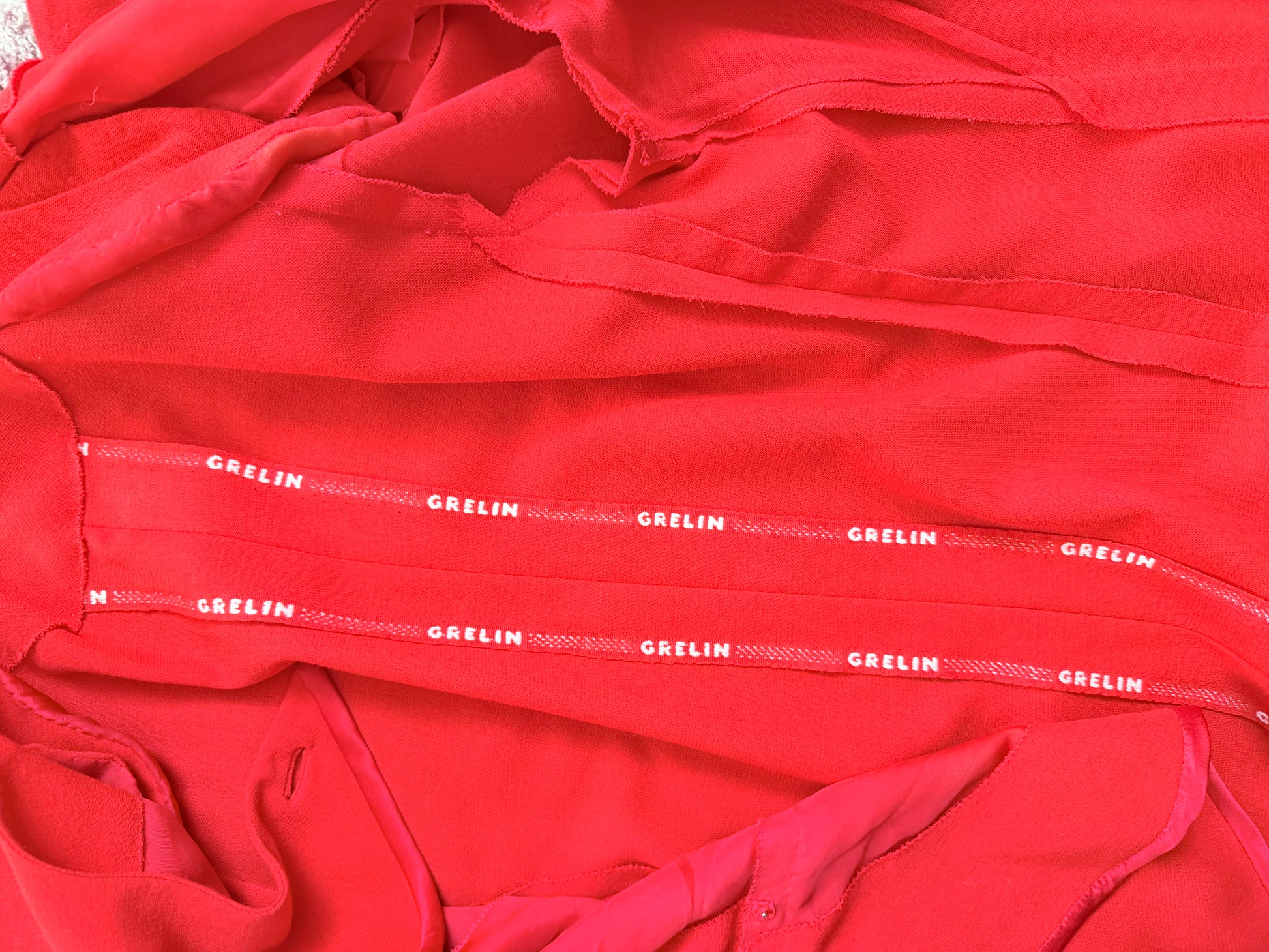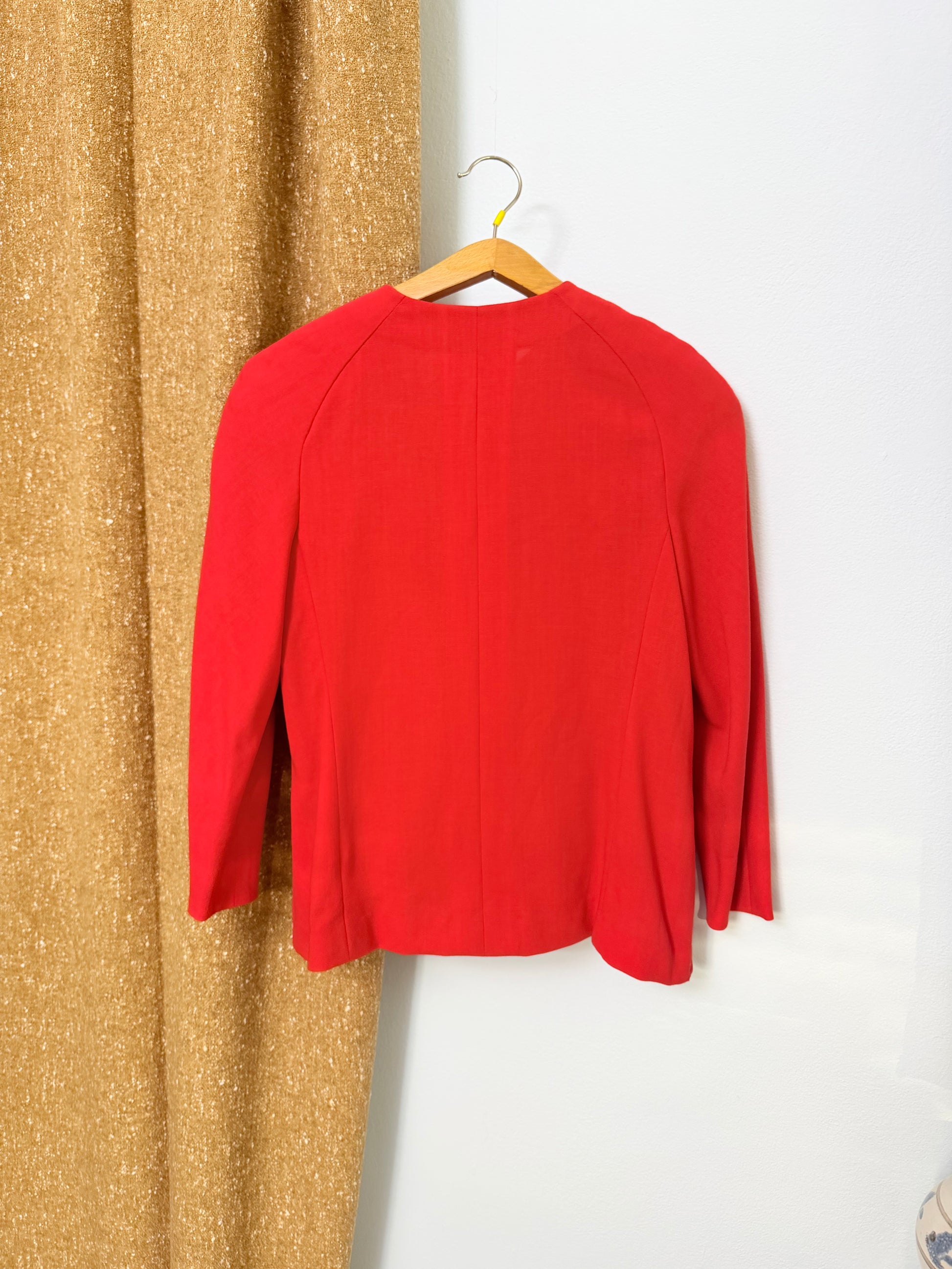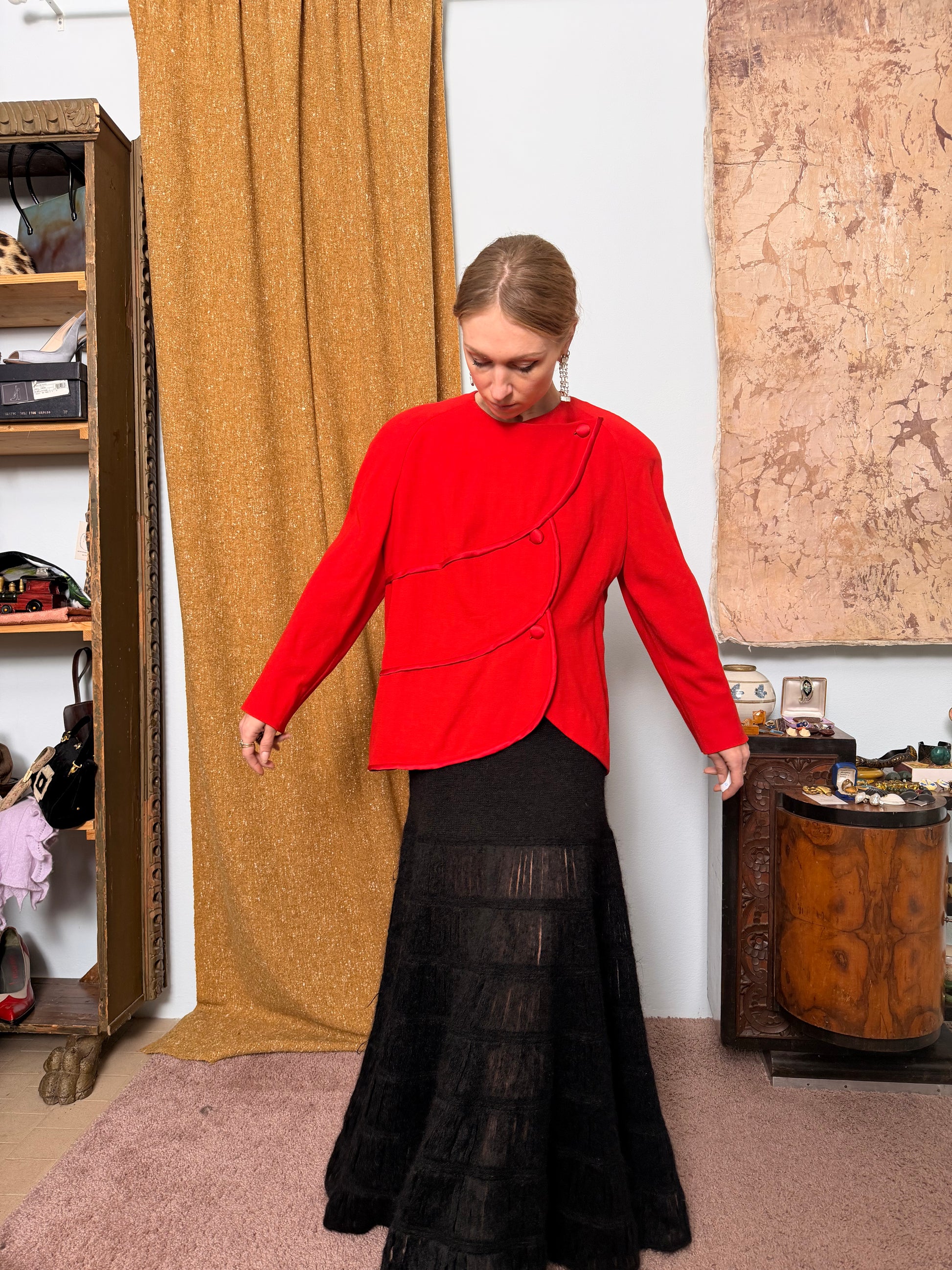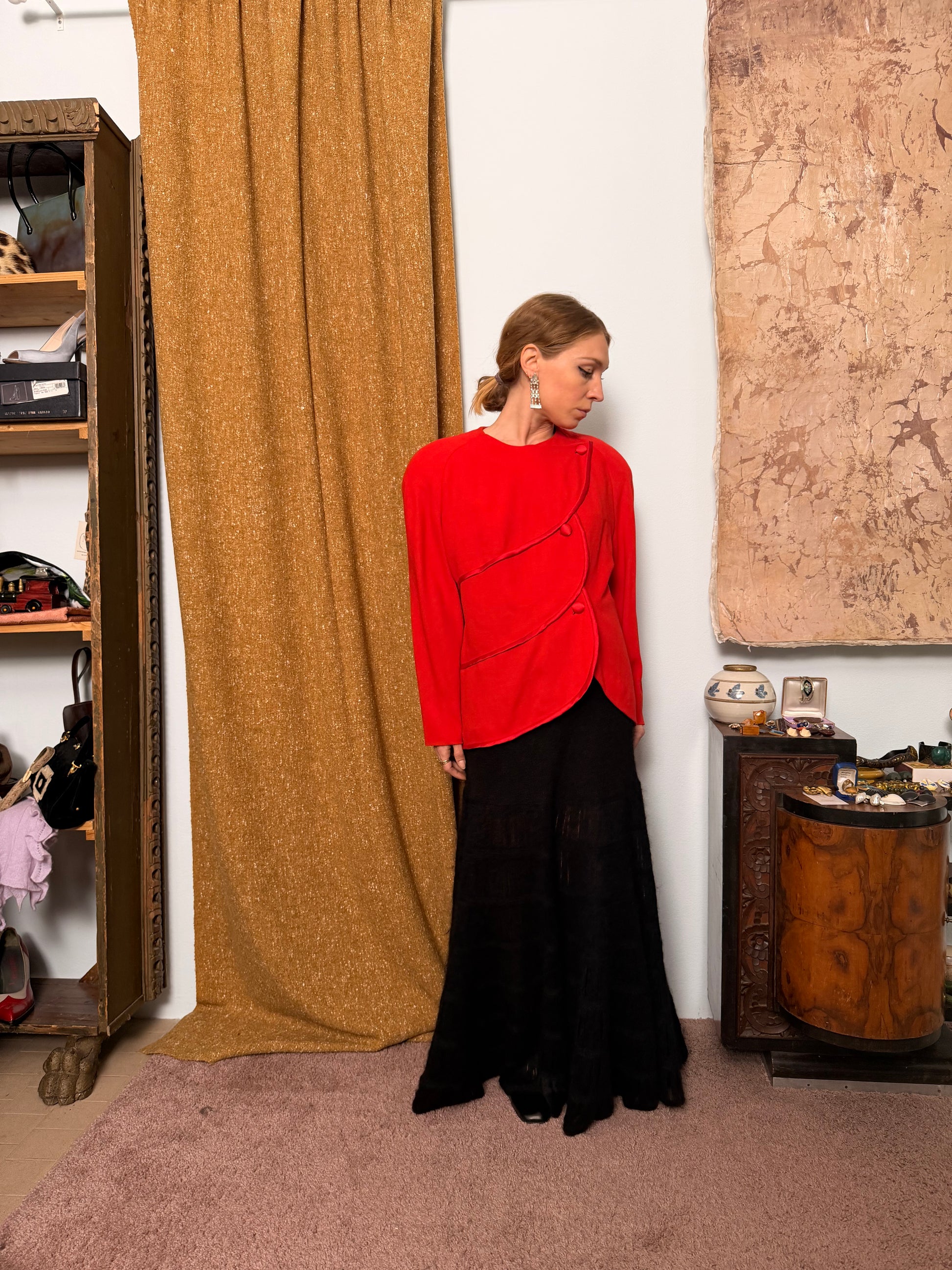 Giacca sartoriale anni 80 rossa con profili in seta e motivo ondulato davanti