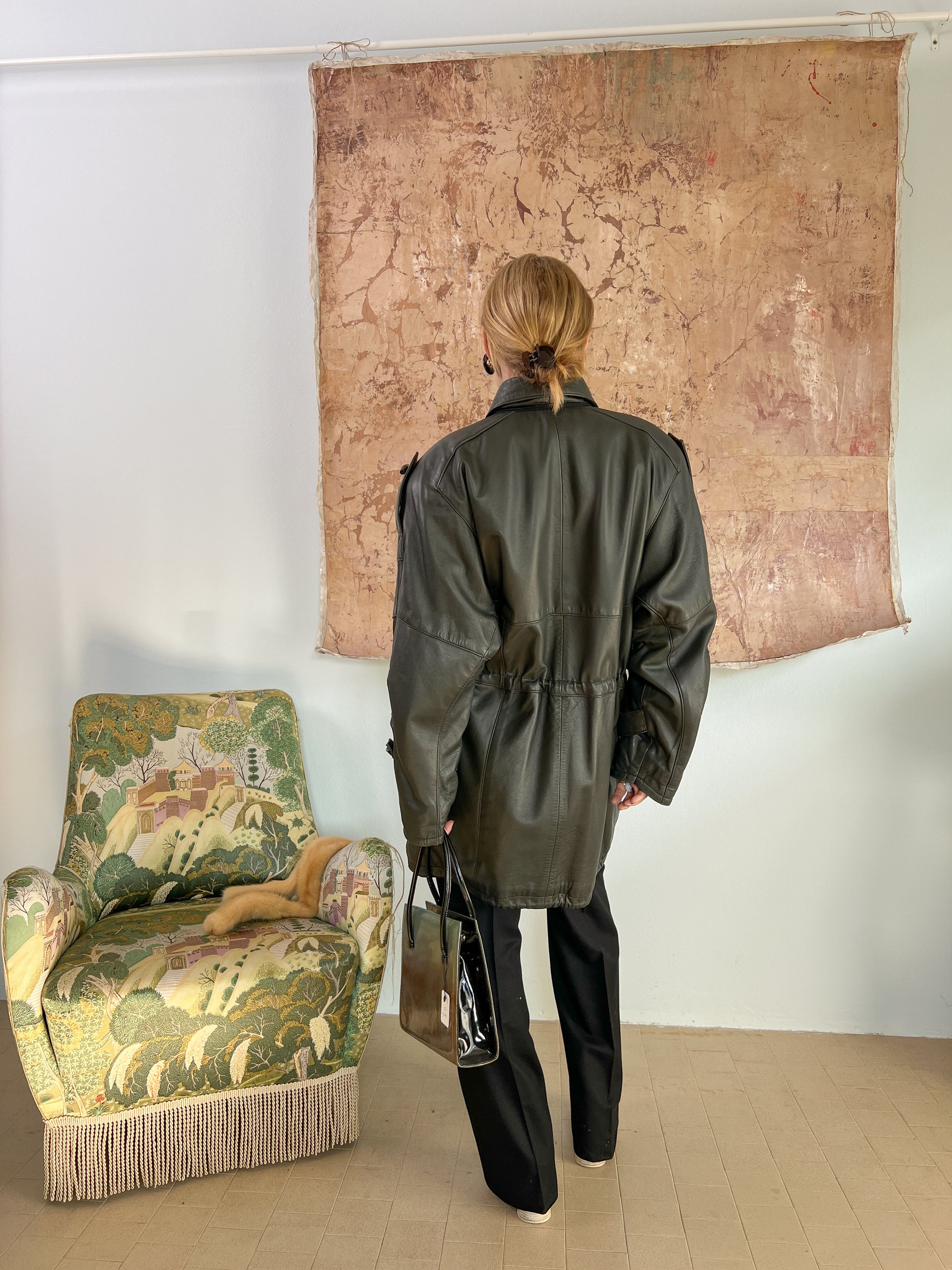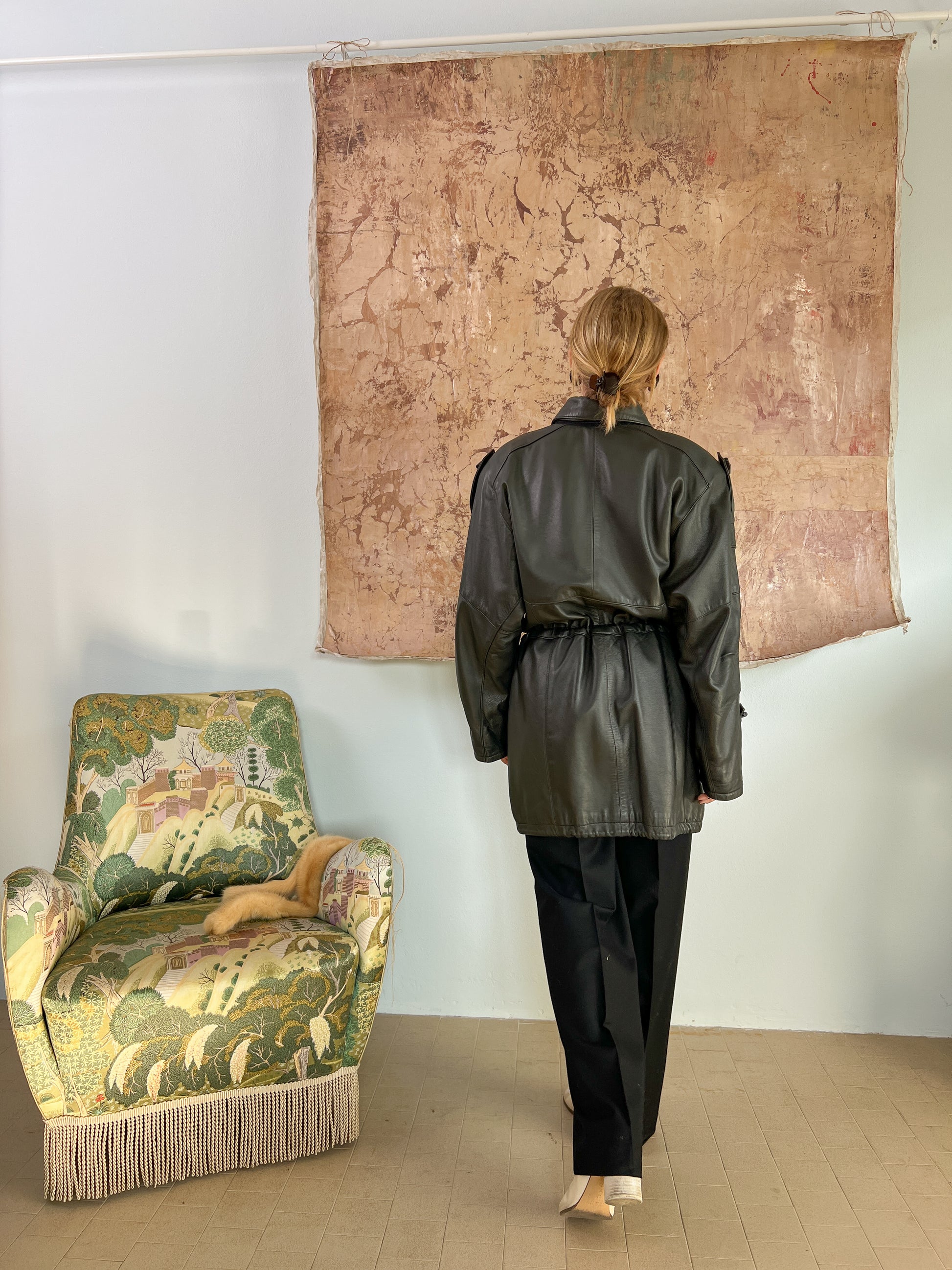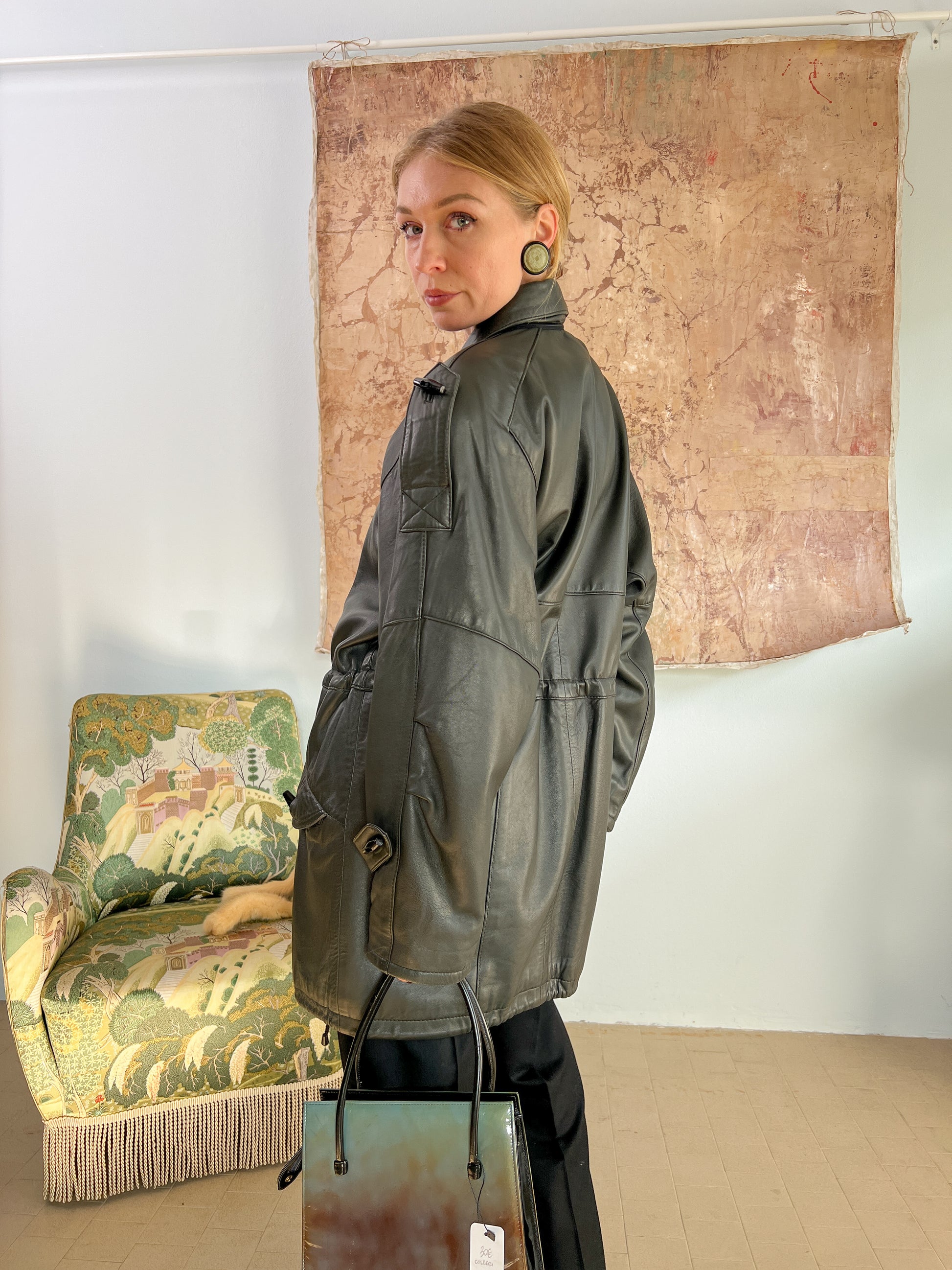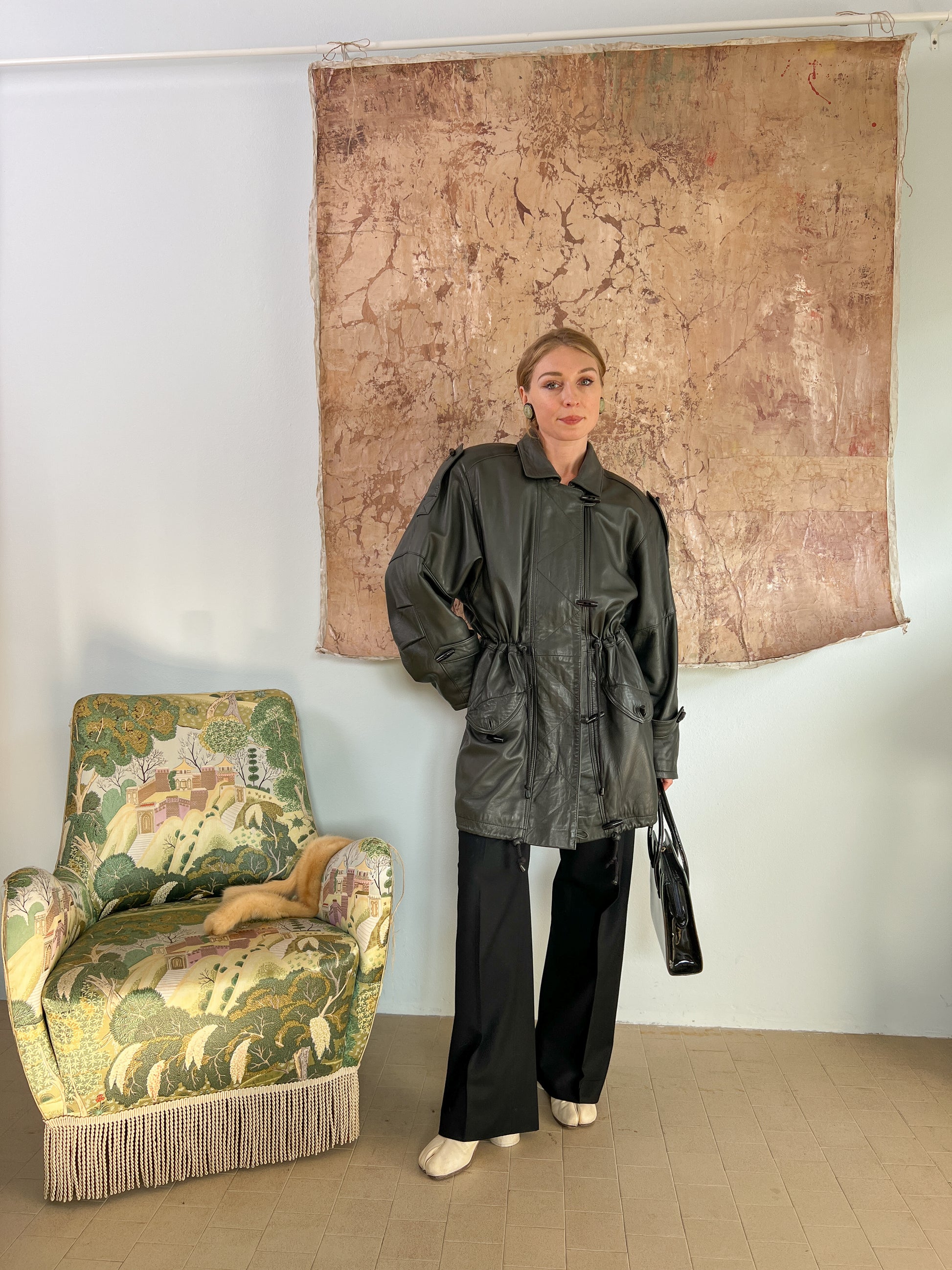 Meraviglioso giubbotto da DONNA, rara bellezza e qualità nelle cuciture e nel pellame, nappa color verde scuro con apertura ad alamari, con coulisse e collo giubbotto. Spalle alte ma che non fanno nessun difetto, a prescindere dalla taglia che porti tu.