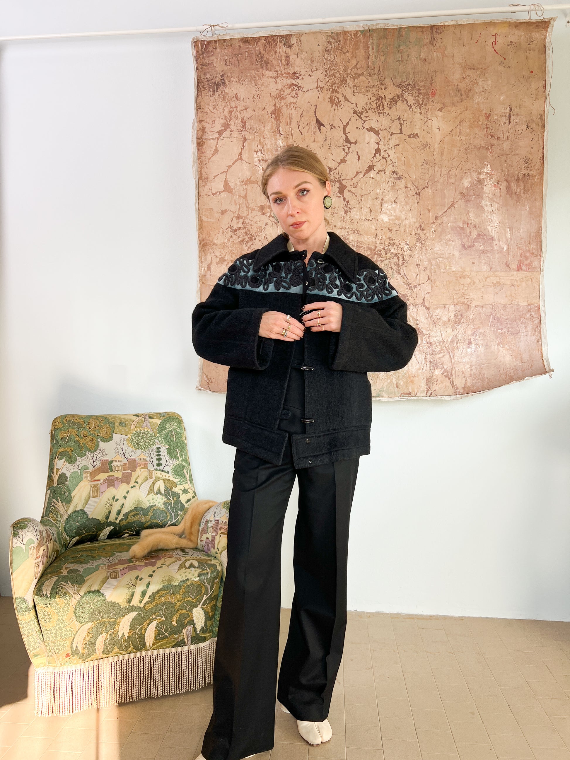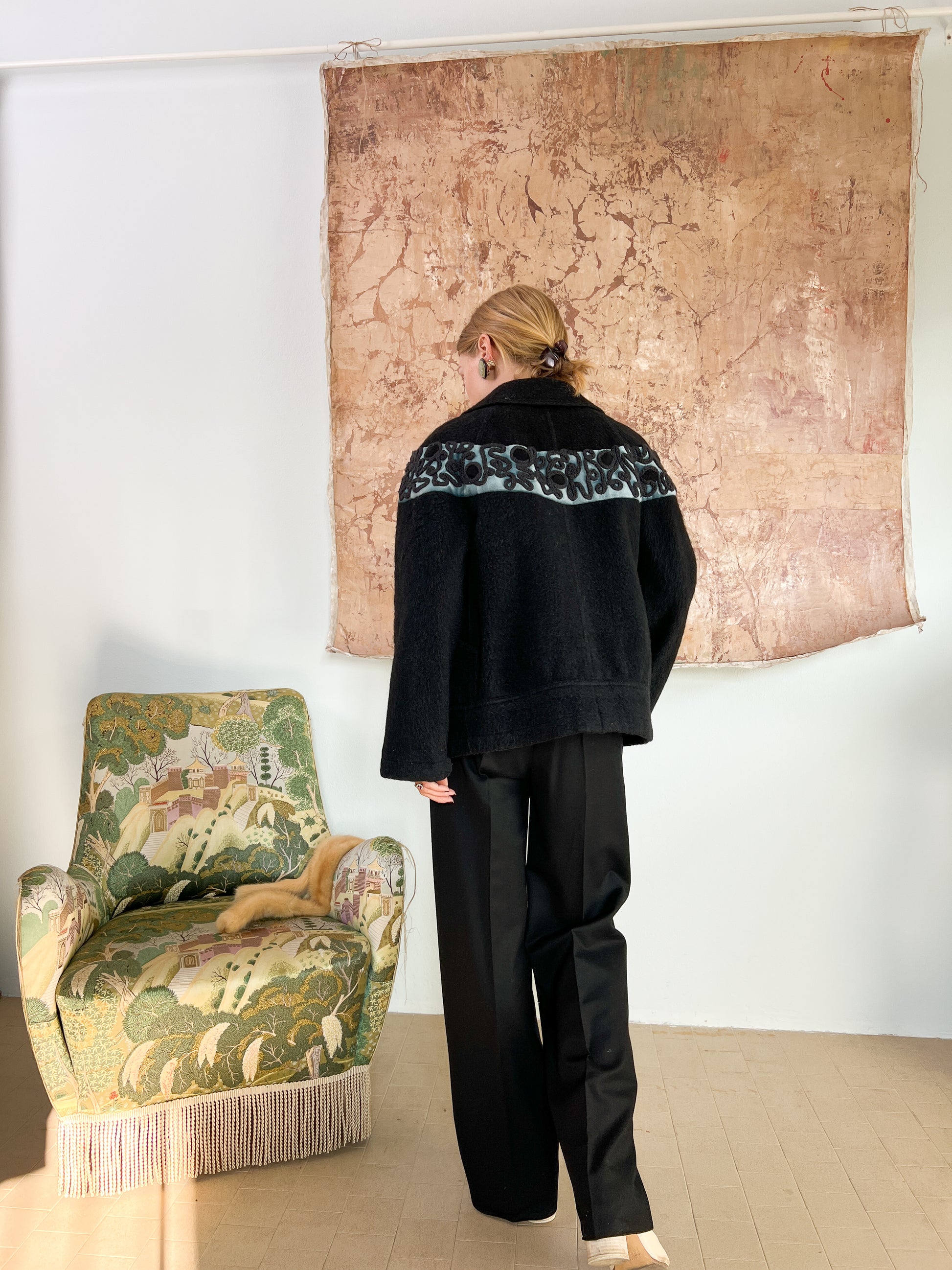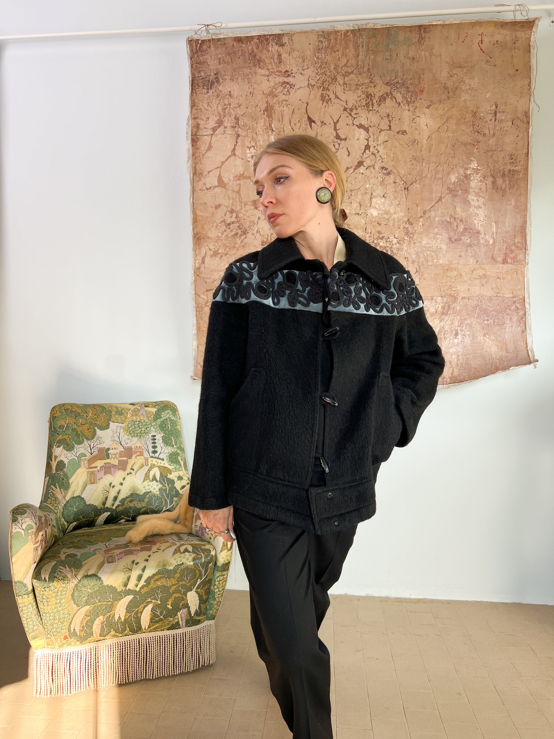 Giubbotto sartoriale ricamato a mano in lana d'alpaca