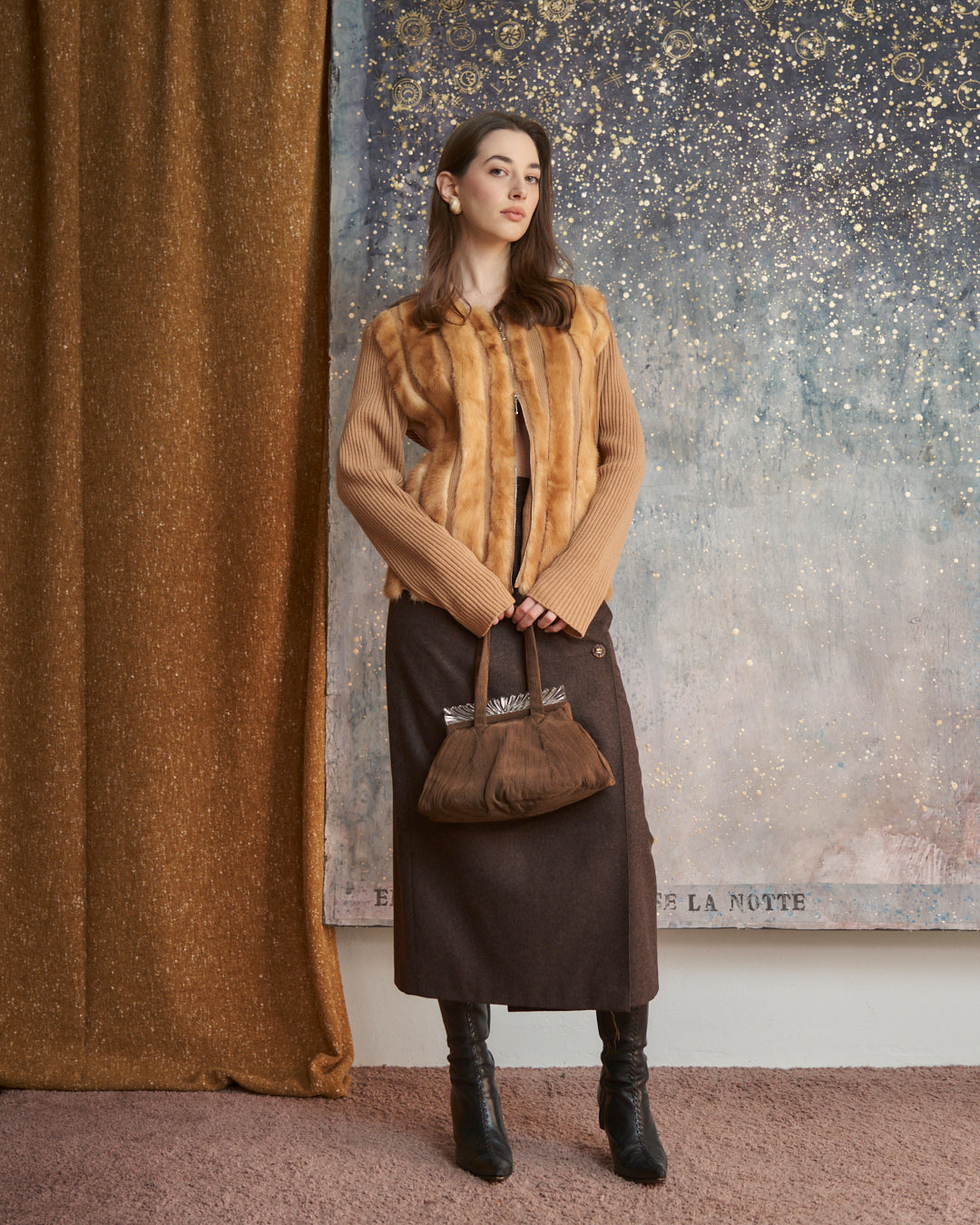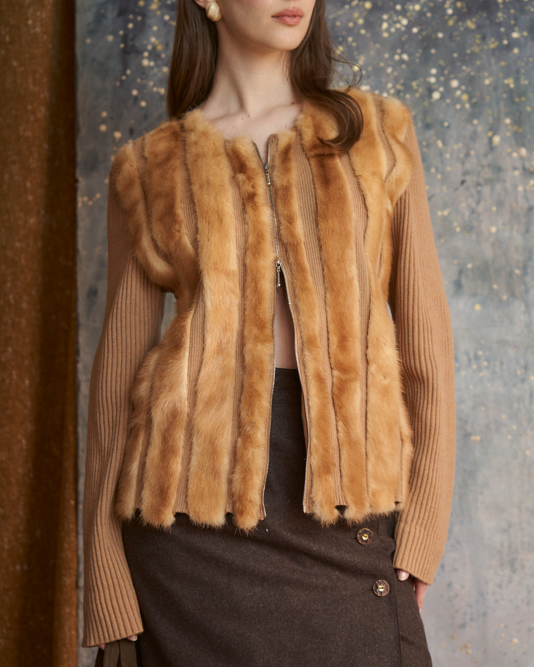 Cardigan in cashmere firmato Cividini color cammello con inserti in visone.