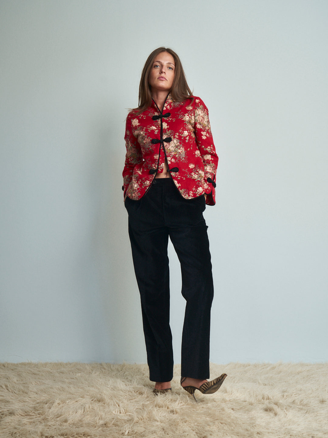 Pantalone Velluto nero taglio classico maschile con doppia piega davanti.