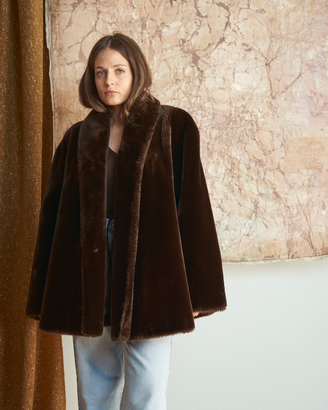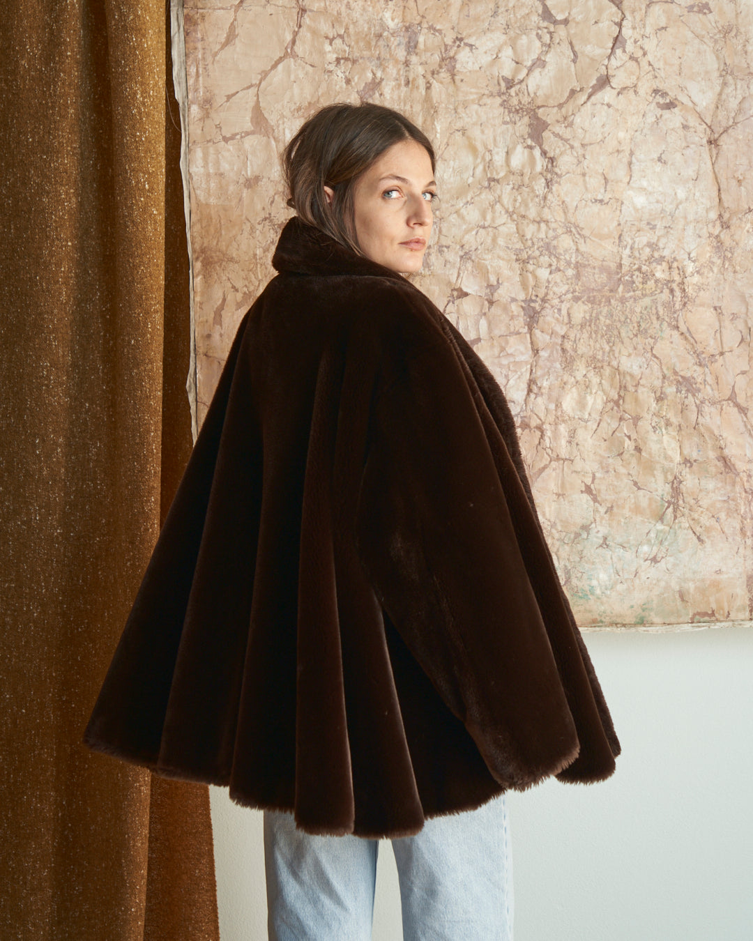 Pelliccia ecologica anni 80 in tonalità marrone cioccolato, un capo che cattura l'essenza del decennio con eleganza contemporanea. Il taglio a ruota, caratteristico dello stile vintage, crea una silhouette sofisticata. Realizzata in materiale ecologico, combina l'estetica retrò con la consapevolezza moderna verso la sostenibilità.