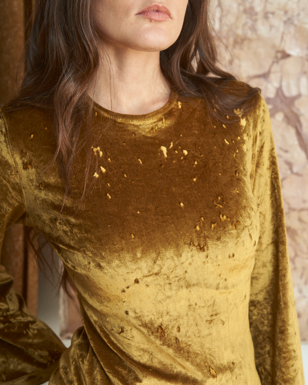 La texture martellata conferisce profondità e movimento al tessuto, creando un effetto visivo sofisticato che cattura la luce con eleganza.