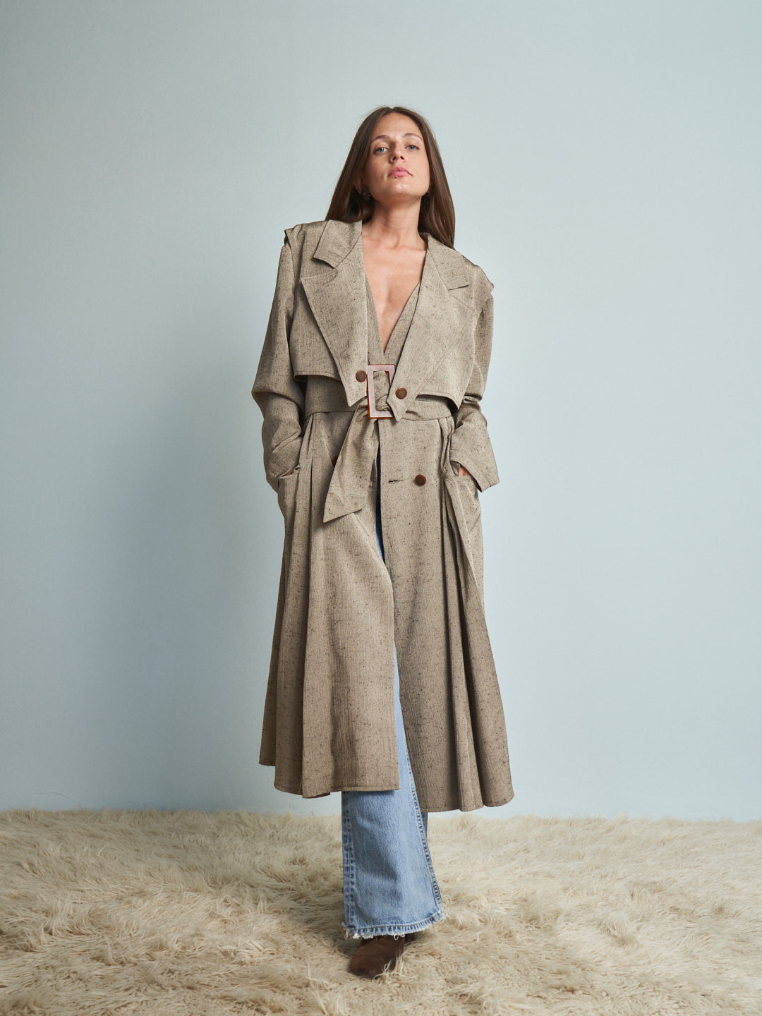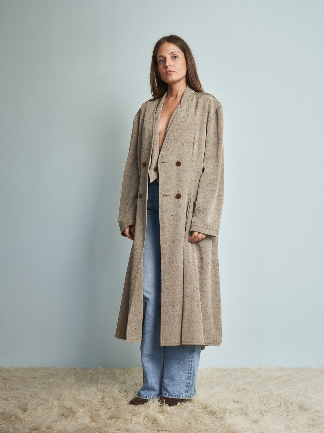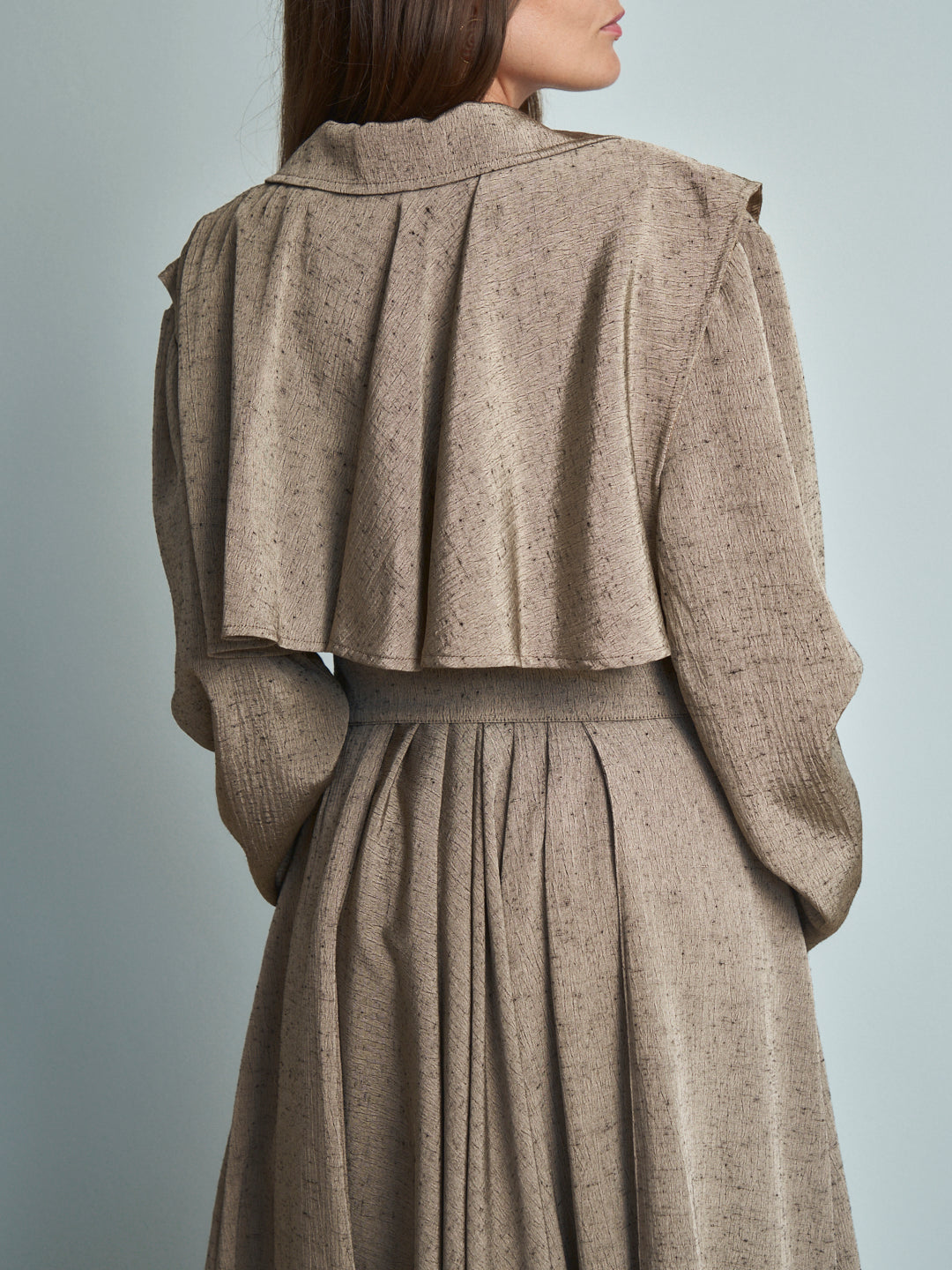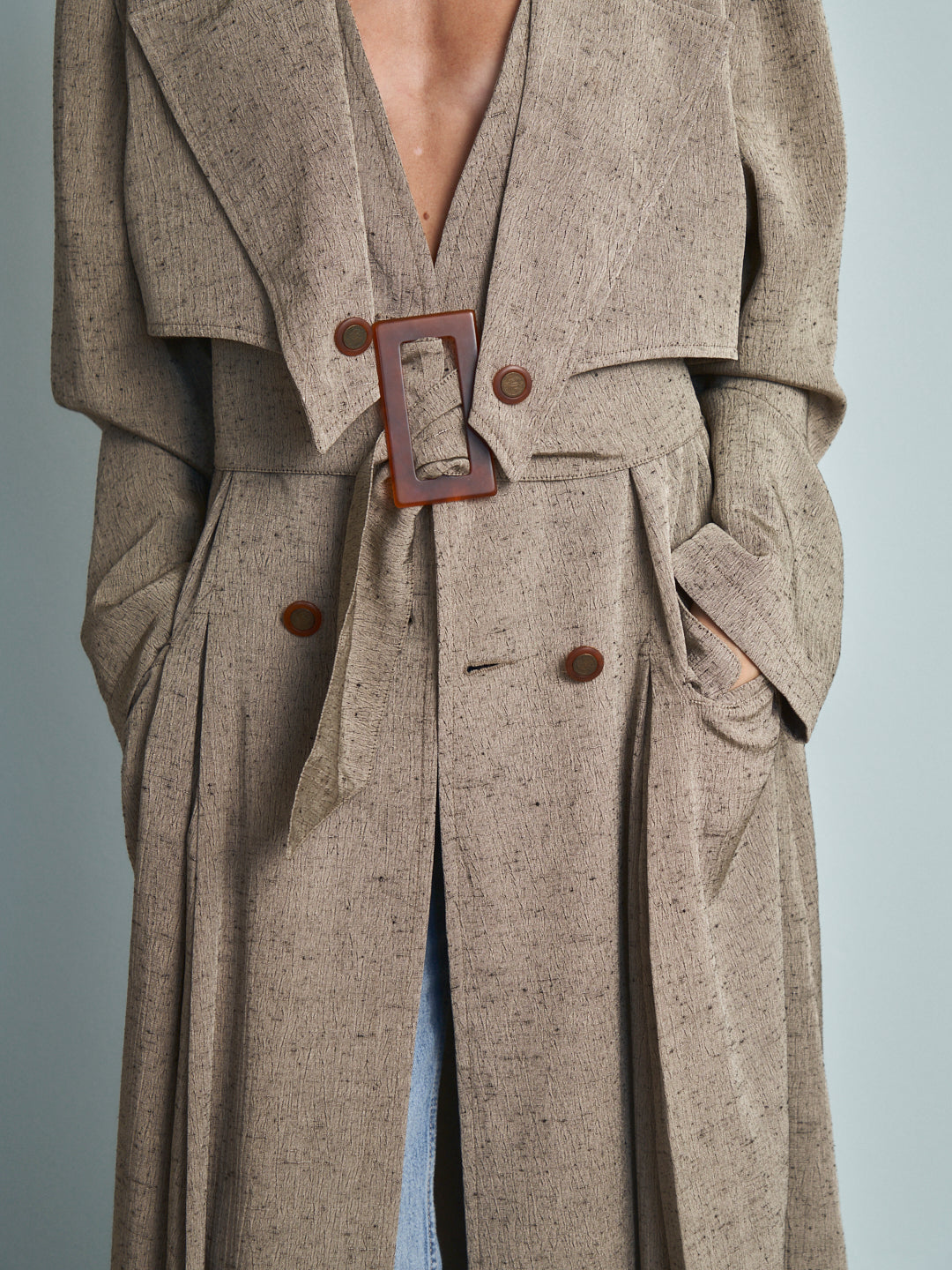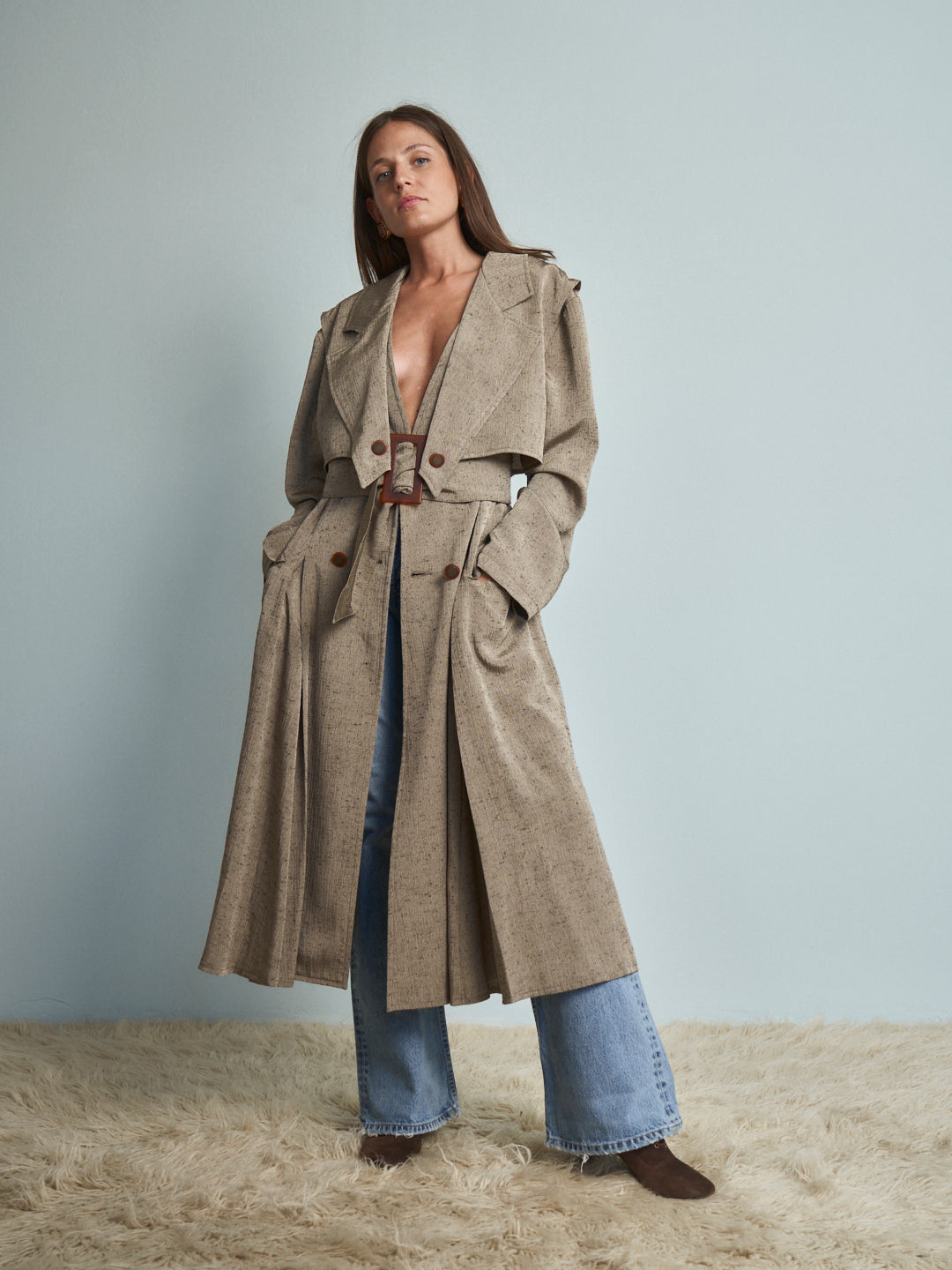 Trench chemisier effetto "robe manteau" in tessuto trama shantung ottoman melange scon pieghe e gilet rimovibile e fusciacca anni 90 slegata dal capo.