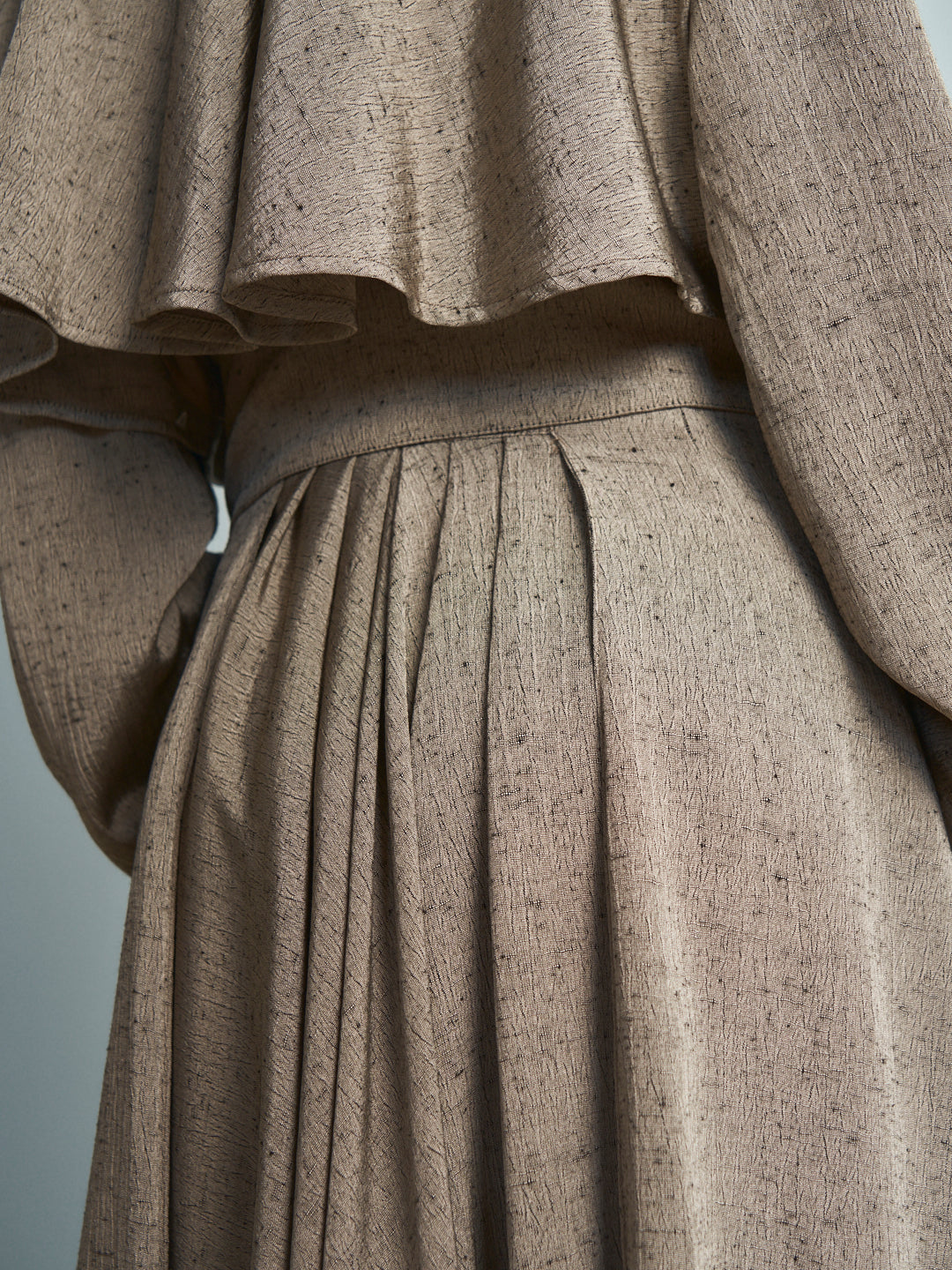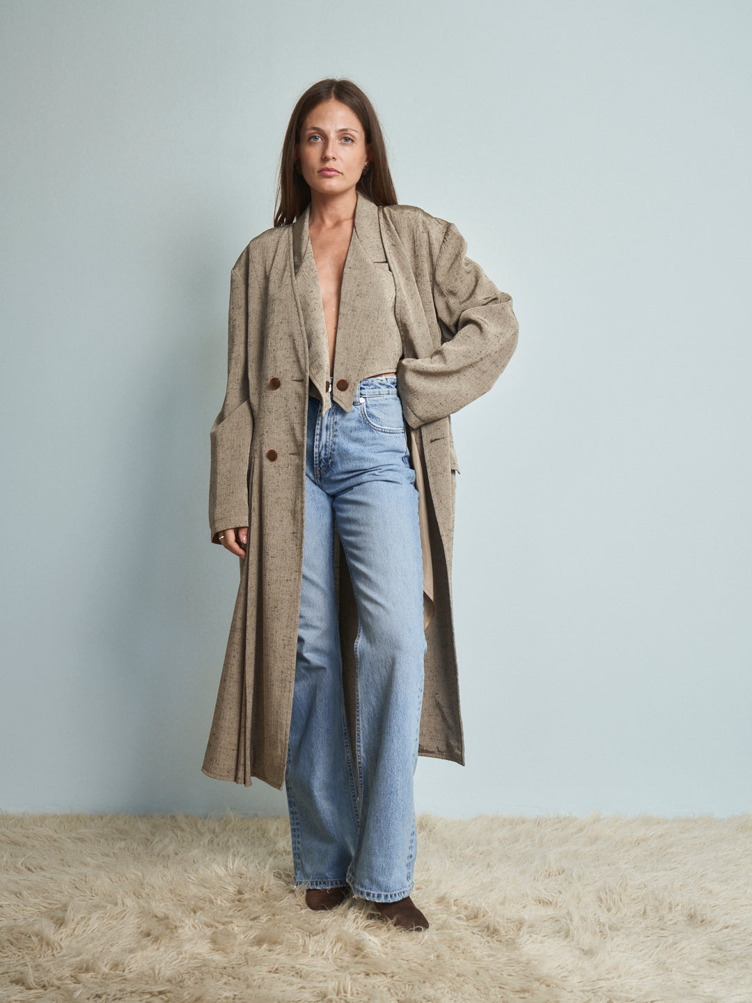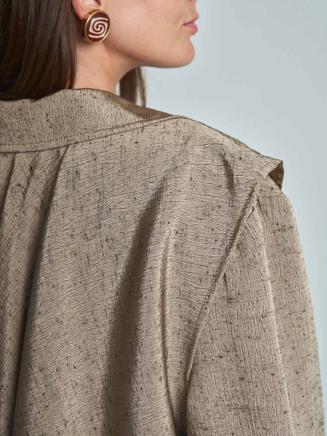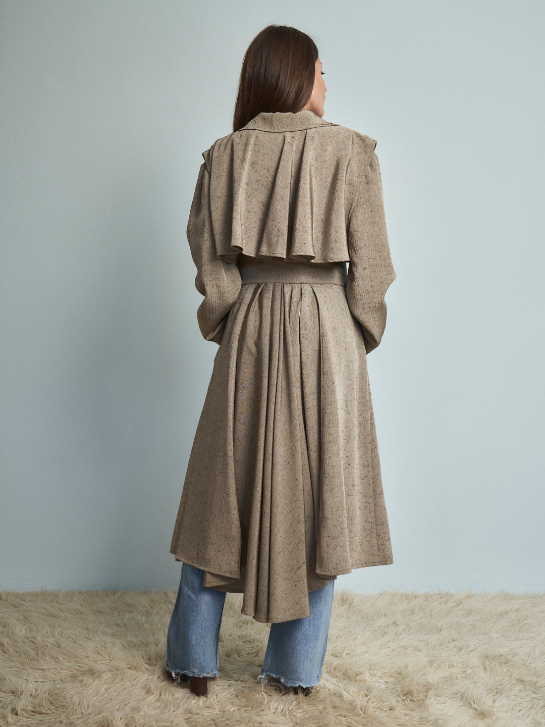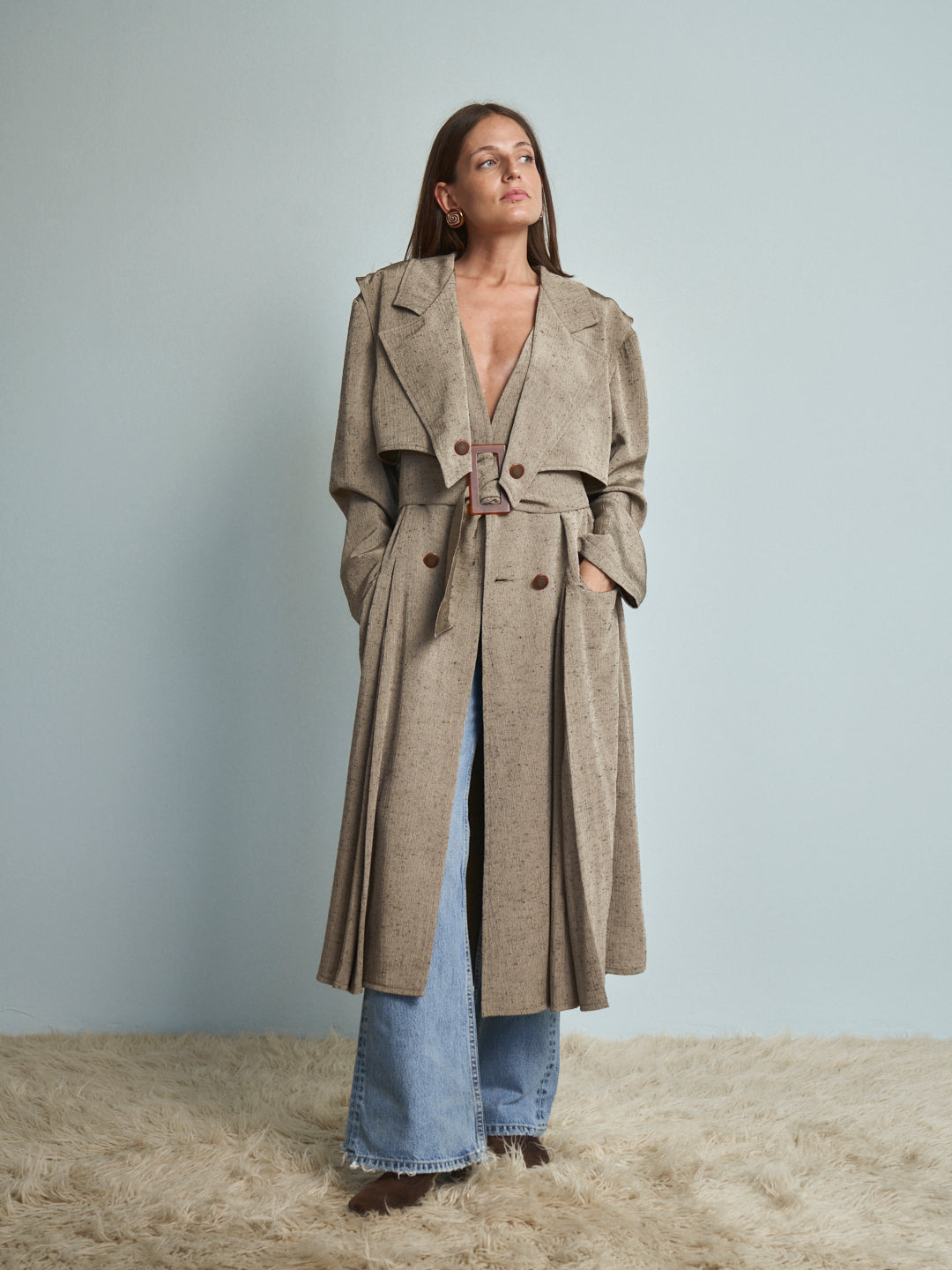 Trench chemisier effetto "robe manteau" in tessuto trama shantung ottoman melange scon pieghe e gilet rimovibile e fusciacca anni 90 slegata dal capo.