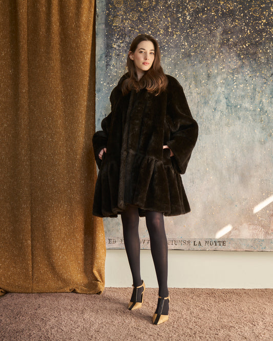 Pelliccia ecologica marrone testa di moro con balza arricciata