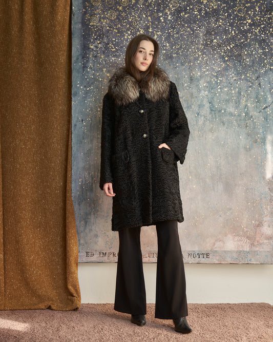 Pelliccia anni 60 astrakan e collo in volpe con doppio spacco dietro