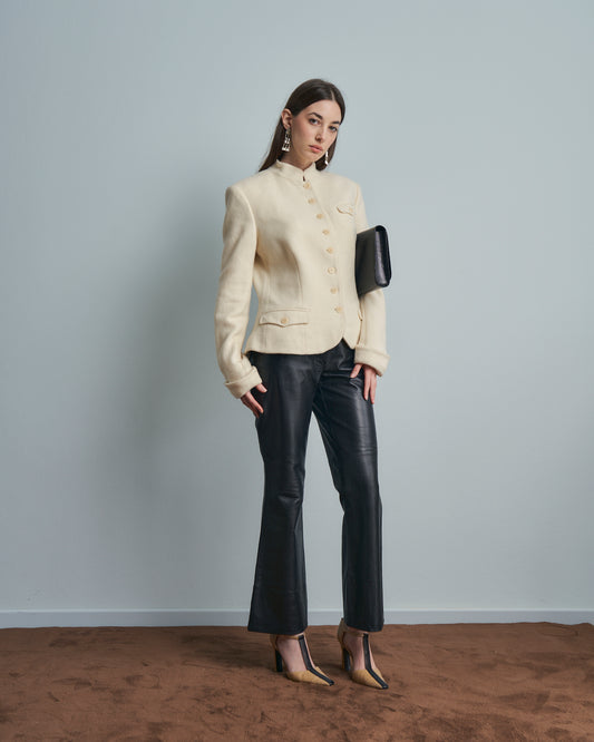 Giacca monopetto in lana e alpaca panna con frange