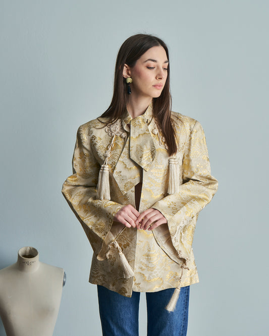 Giacca orientale vintage dorata con nappe e nodo al collo