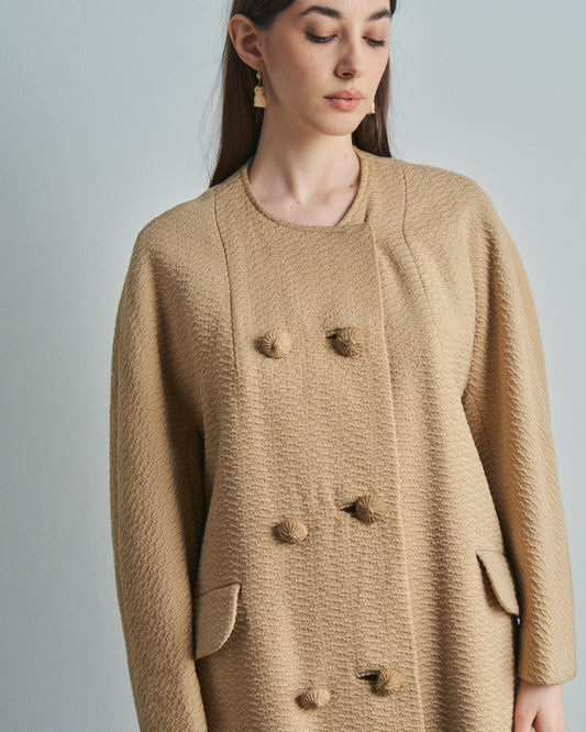 Cappotto sartoriale americano anni 60 con spalla kimono in tessuto jacquard e bottoni