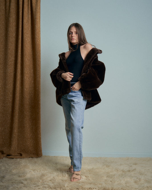 Pelliccia ecologica marrone cioccolato corta con tasche