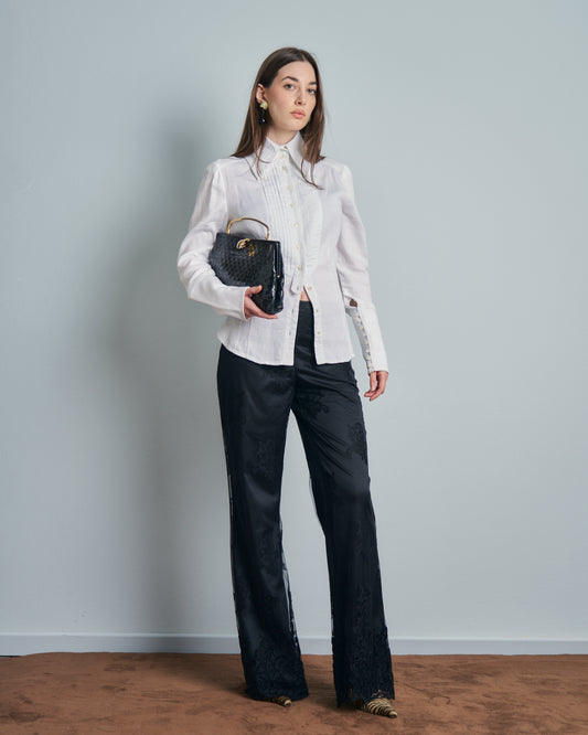 Pantaloni La Perla in pizzo, raso e ciniglia neri svasati