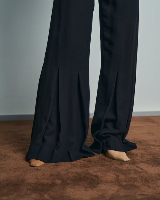 Pantalone sartoriale in tessuto seta crepe a pieghe gamba svasata