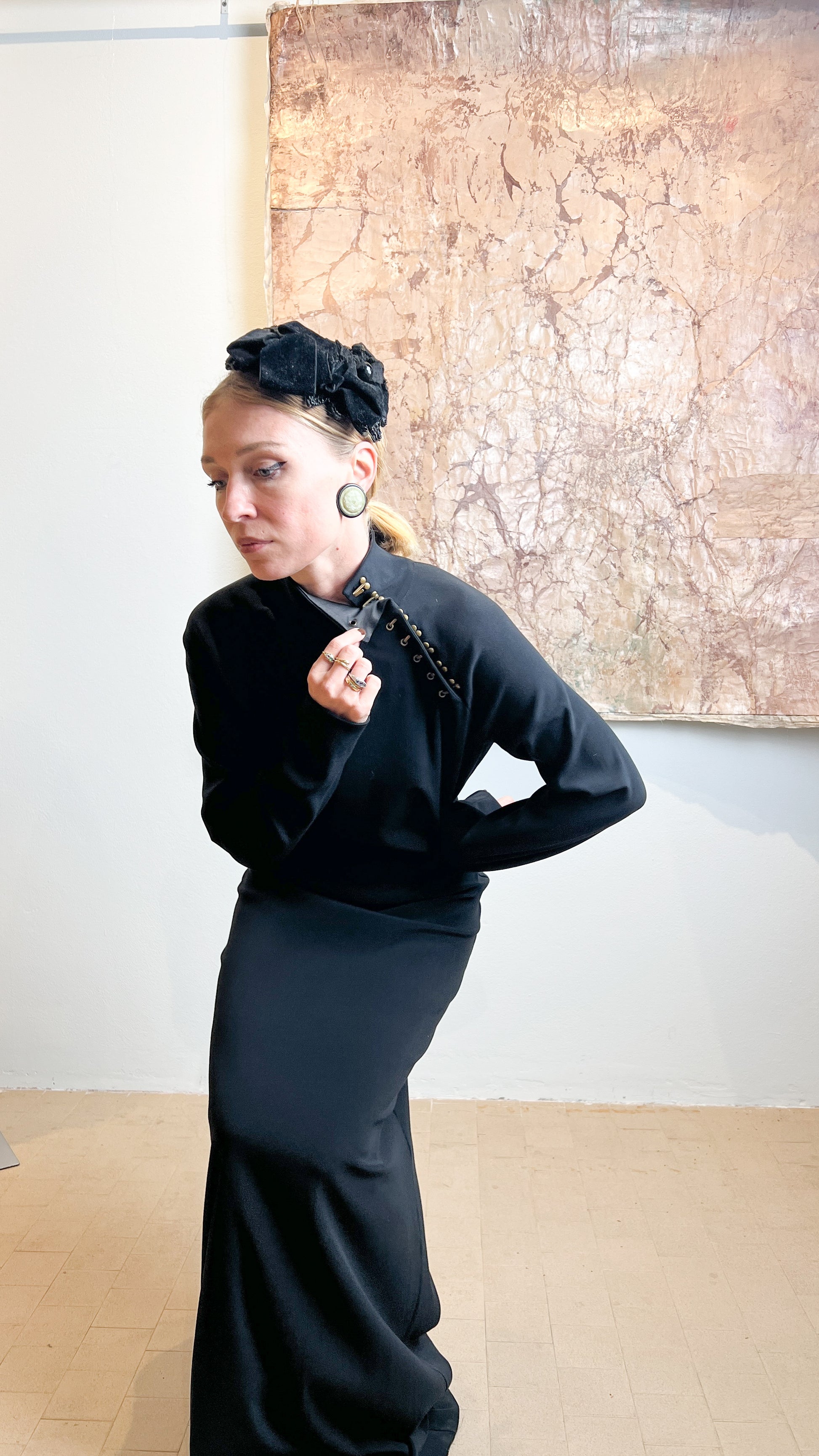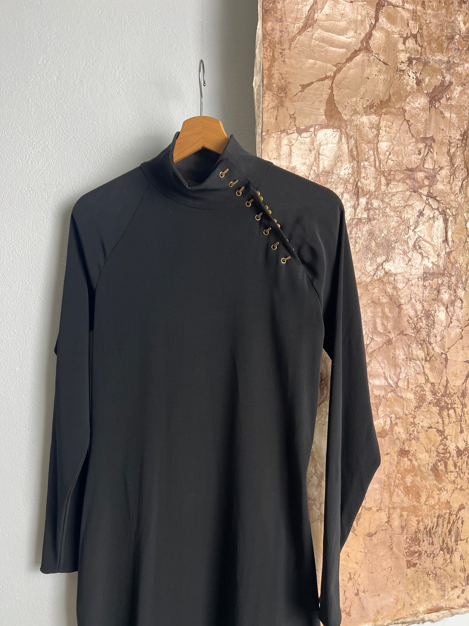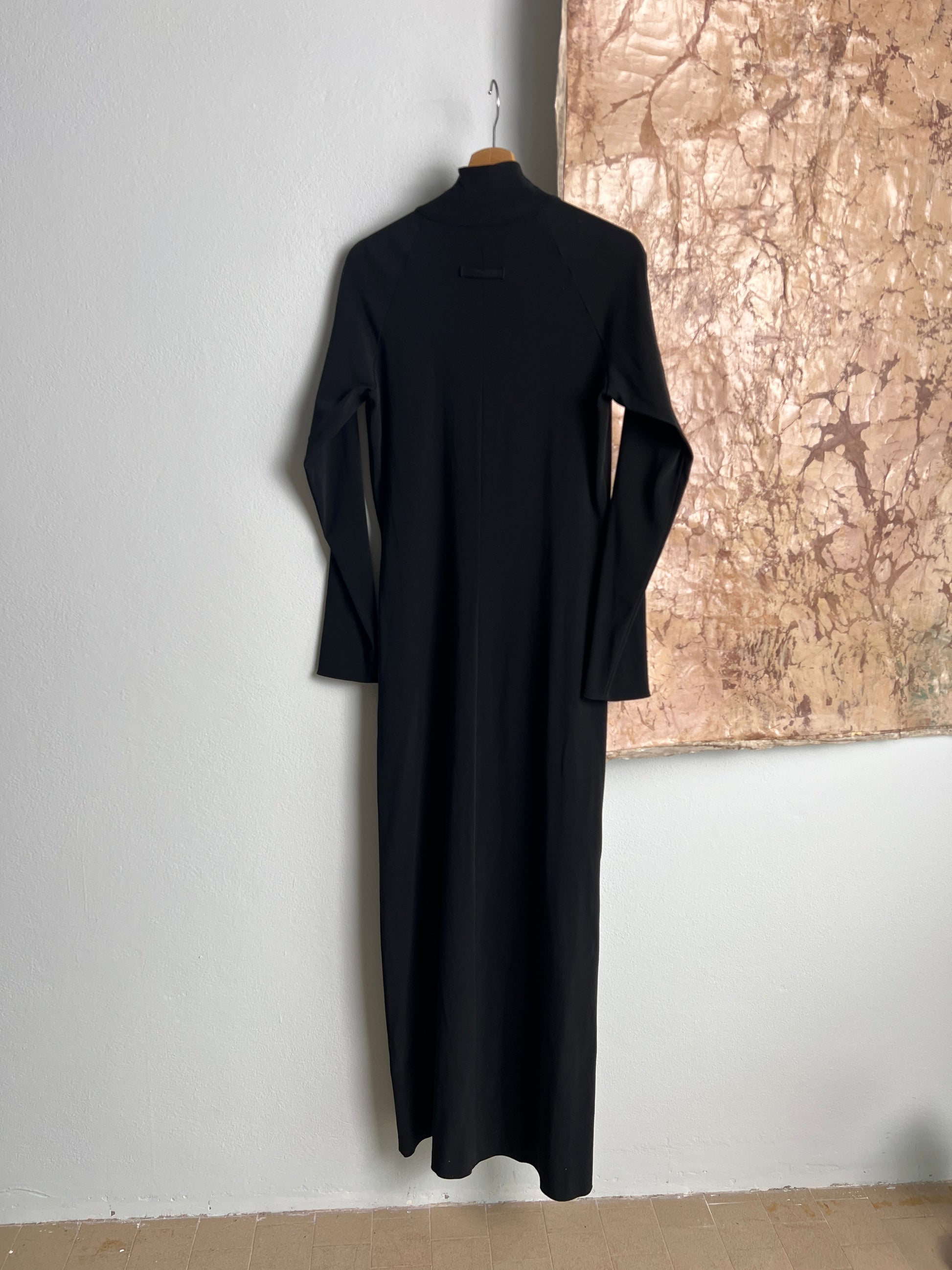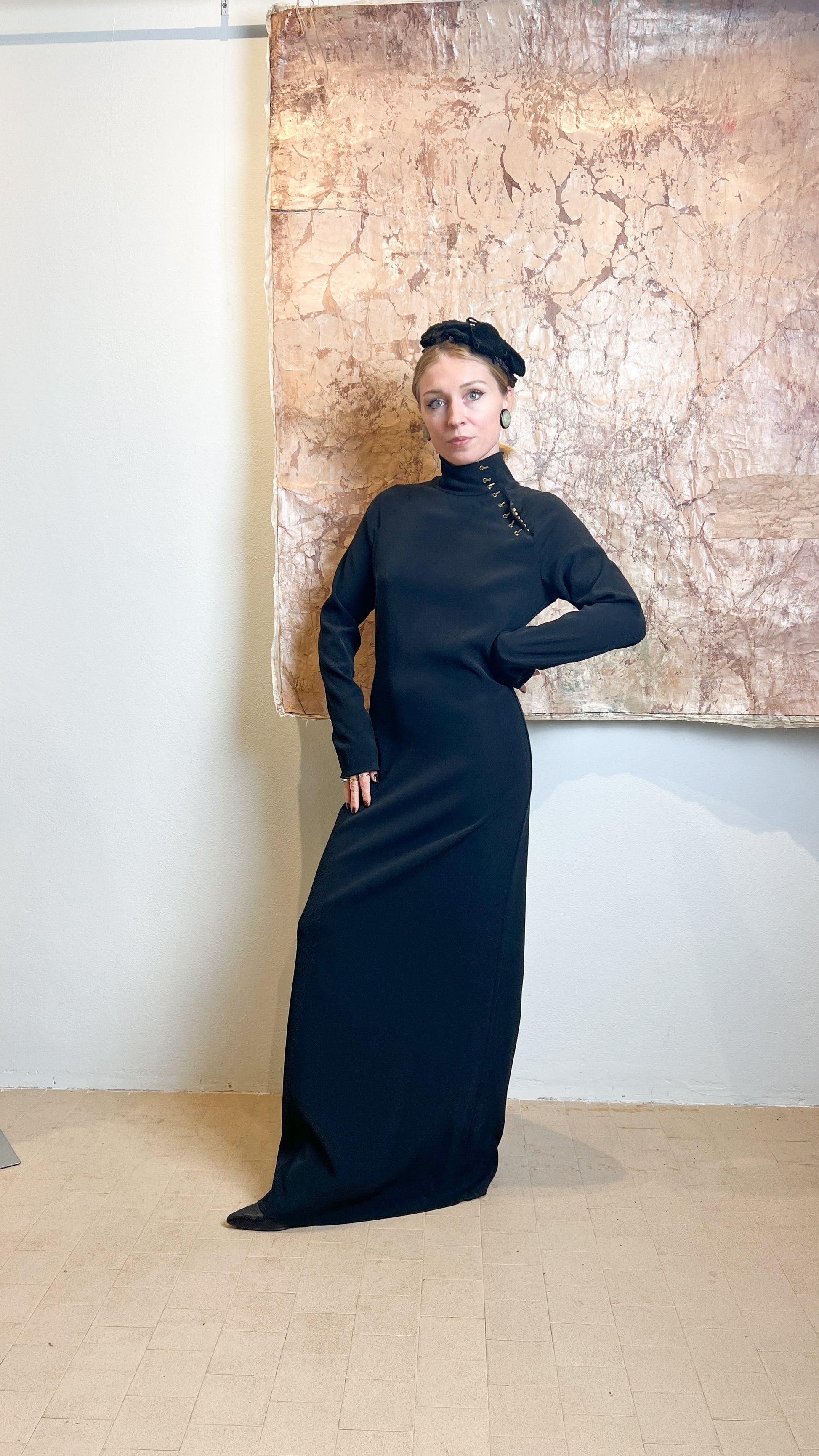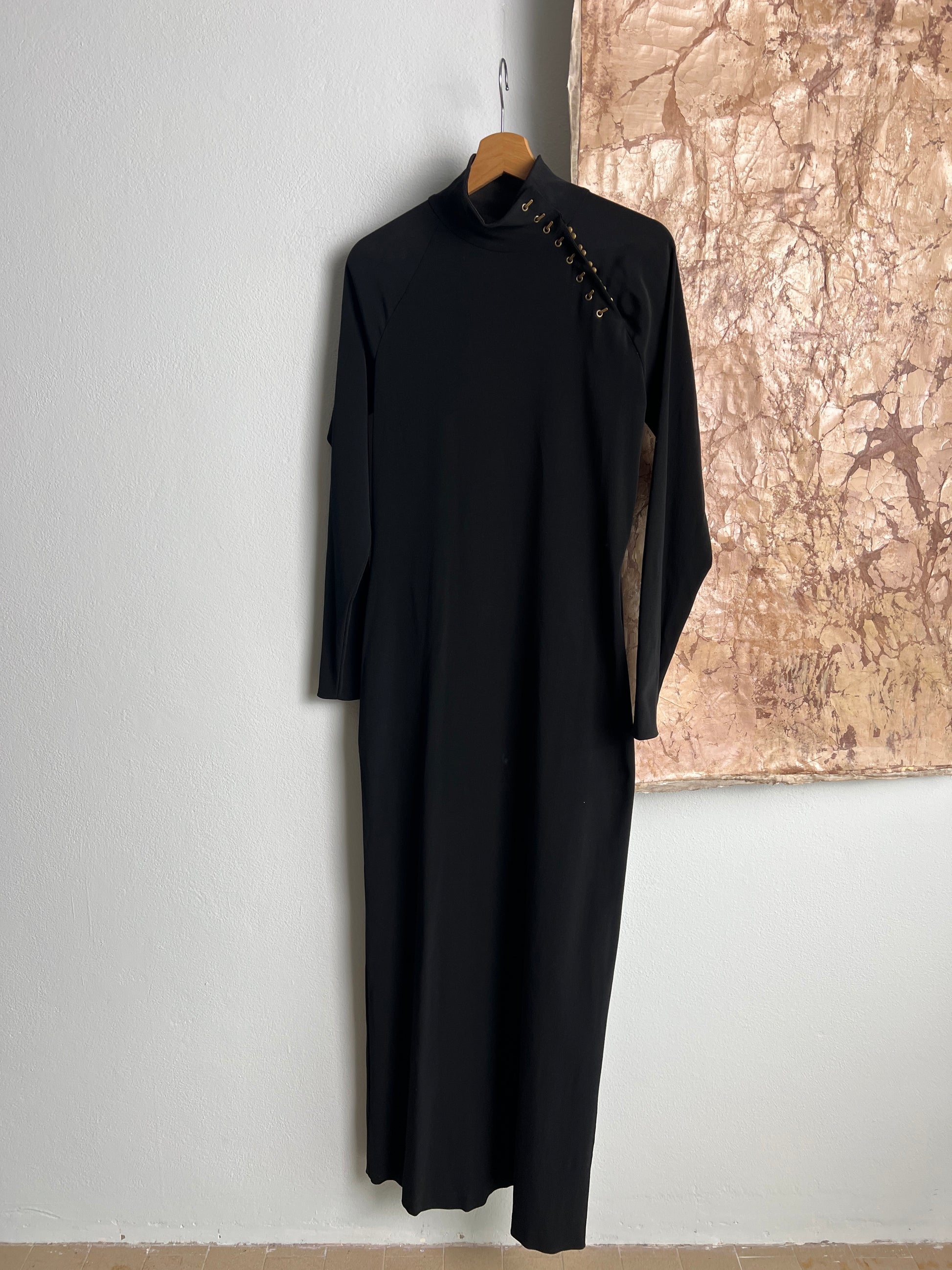 Abito lungo in crêpe elasticizzata con apertura collo qpao con uncinelli in galvanica ottone