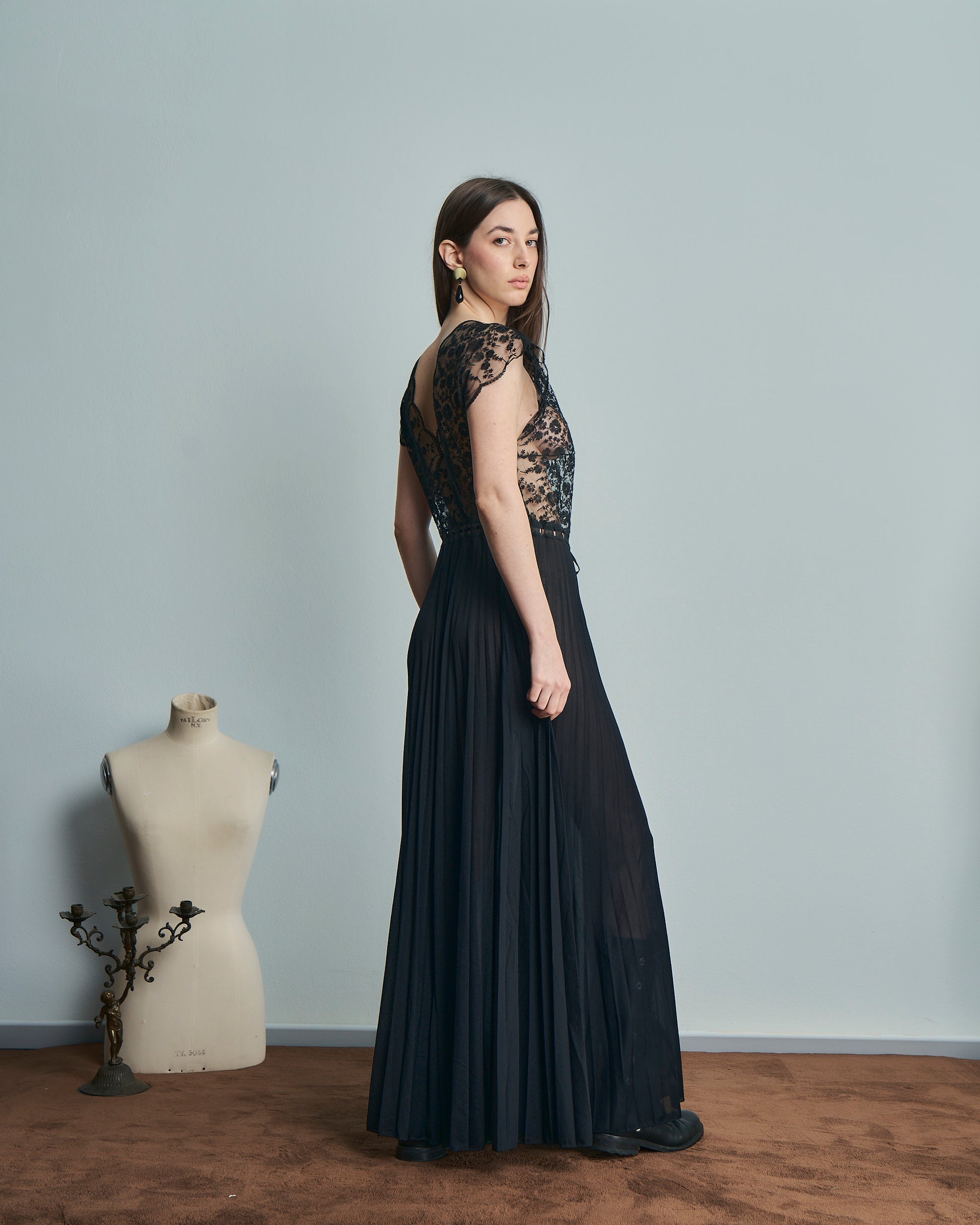 Abito lingerie anni 70 con gonna plissettata e bustino in pizzo