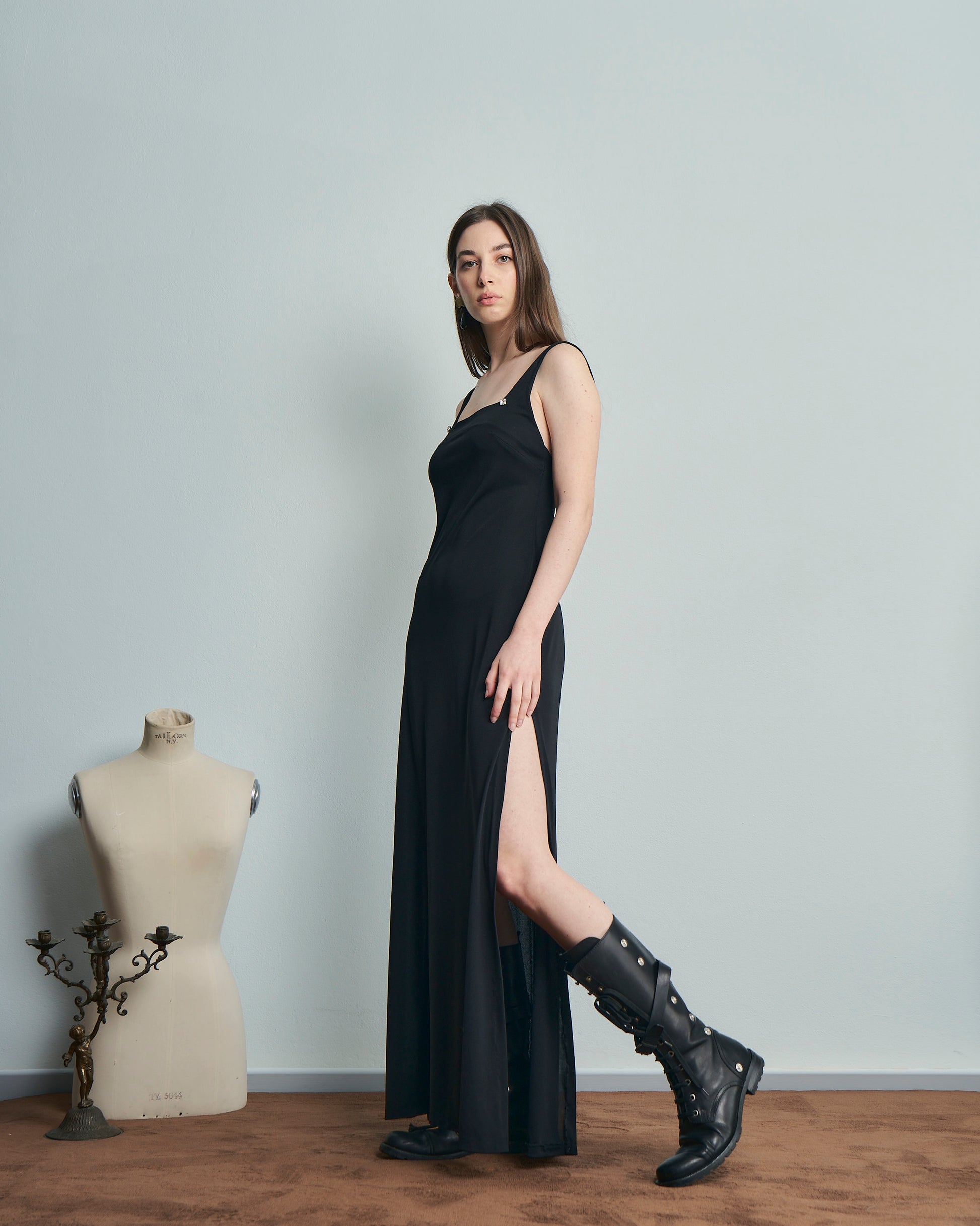 Abito lungo con spacco in jersey crepe anni 90 scollatura sulla schiena.