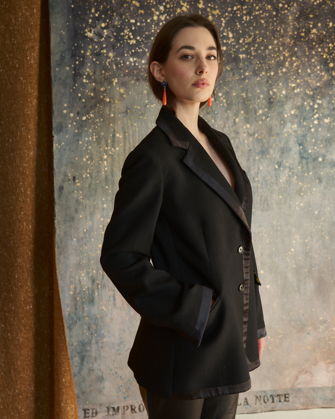 Modello monopetto con apertura a due bottoni, sfiancato.