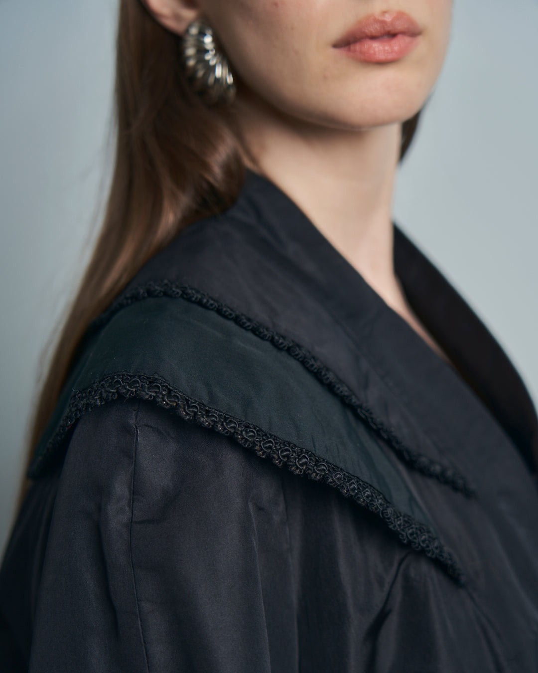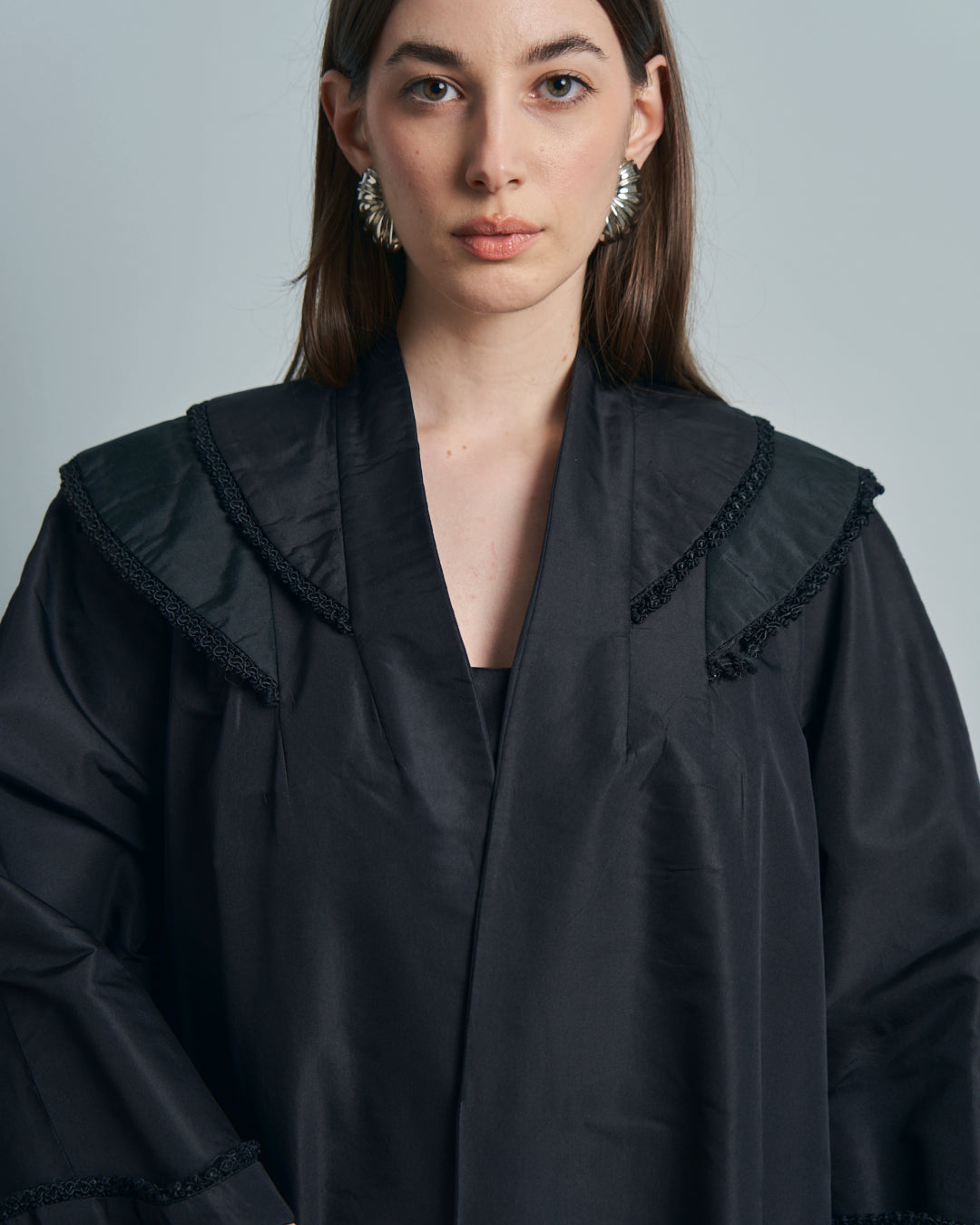 Cappotto anni 50 in seta con collo ampio e passamanerie
