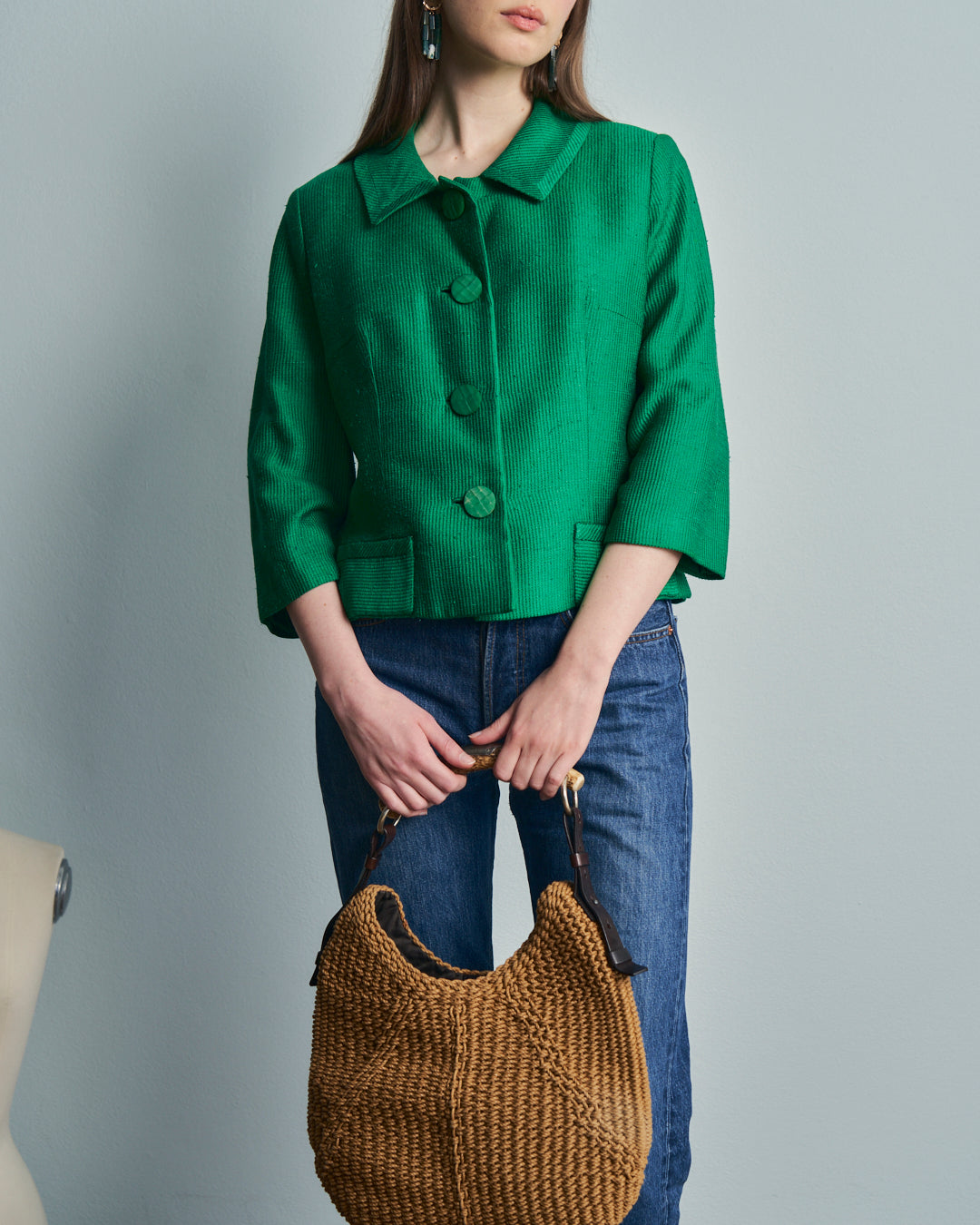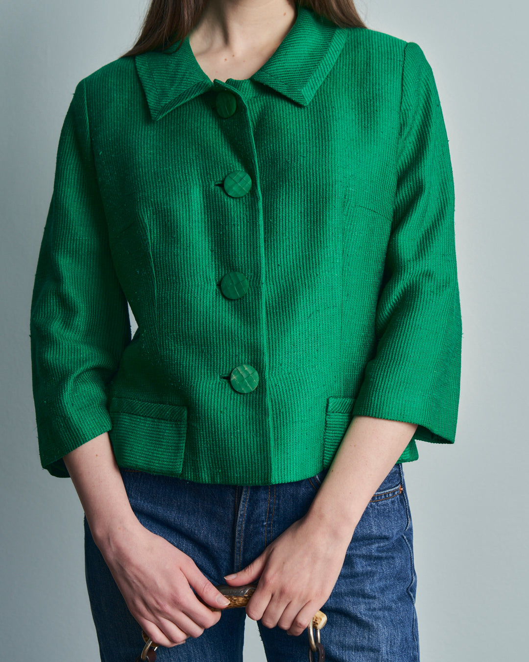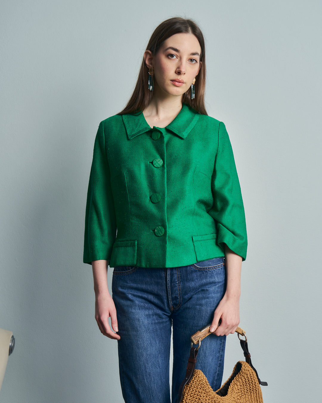Giacca corta in seta anni 50 verde con spacchetti e taschine