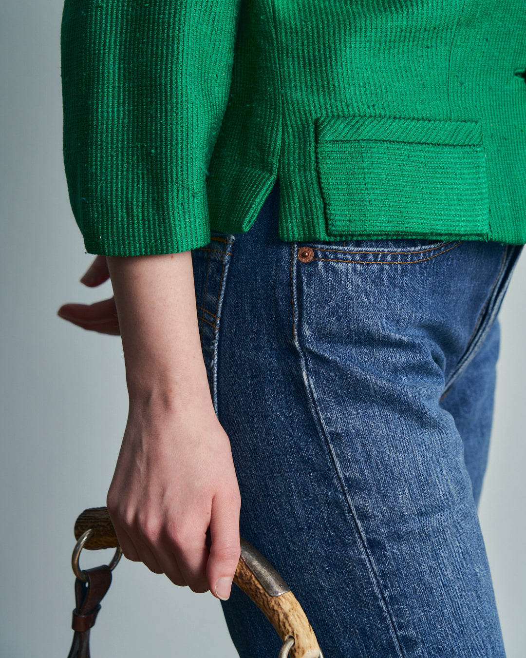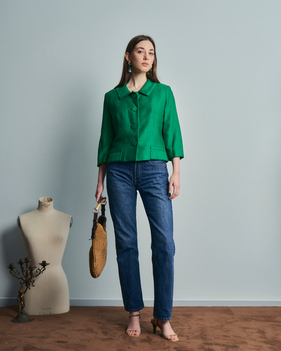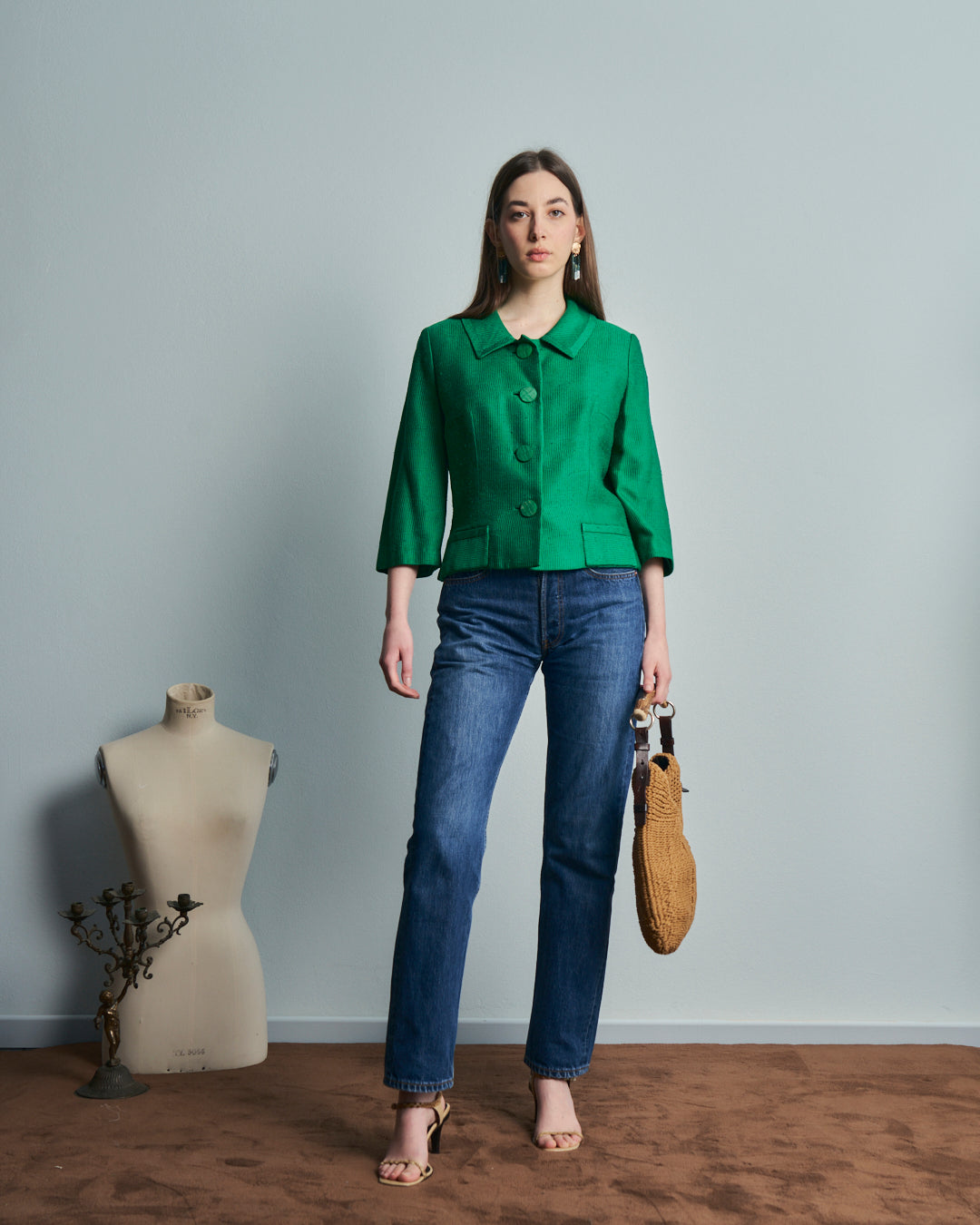 Giacca corta in seta anni 50 verde con spacchetti e taschine