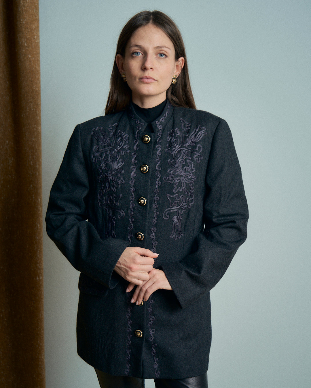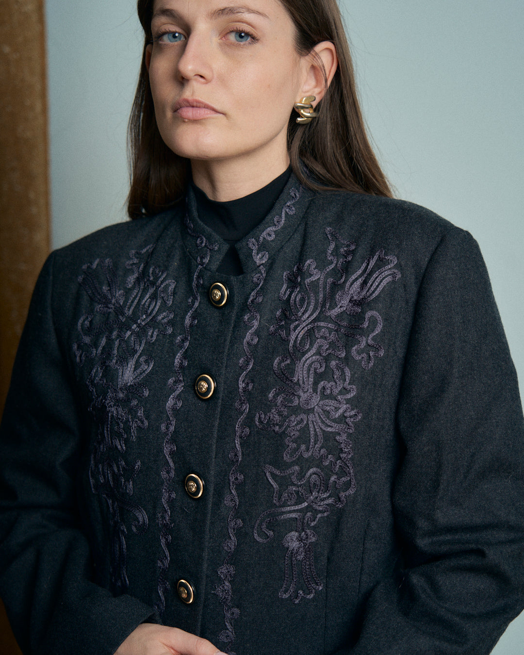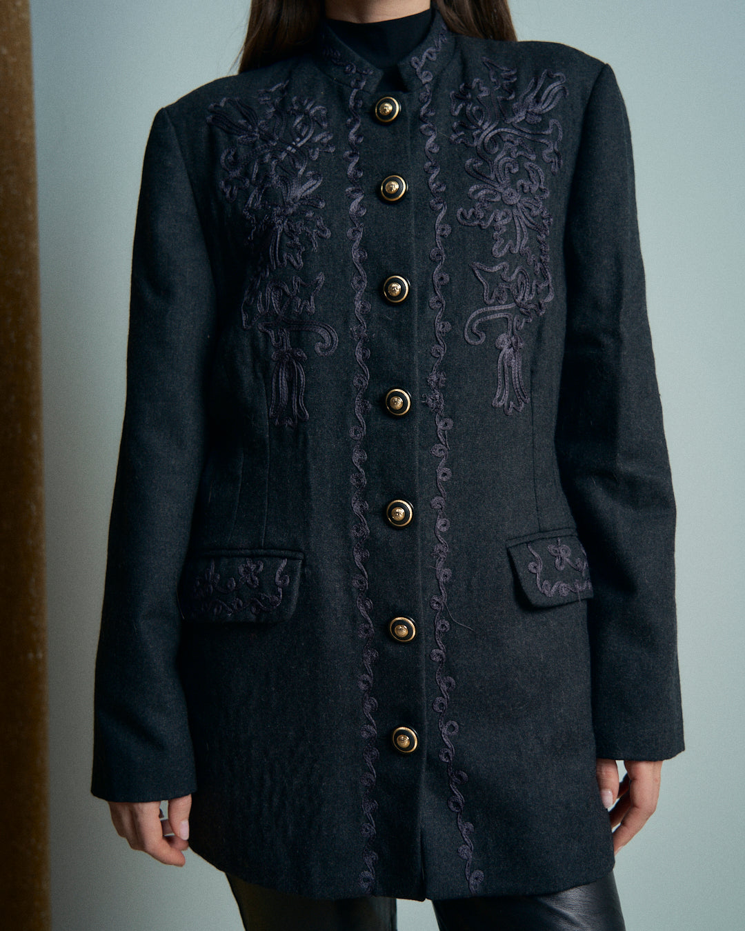 Giacca con collo coreano vintage in lana con ricami a fettuccia e bottoni in metallo