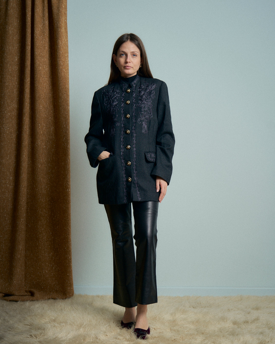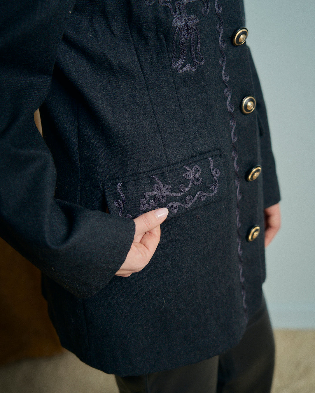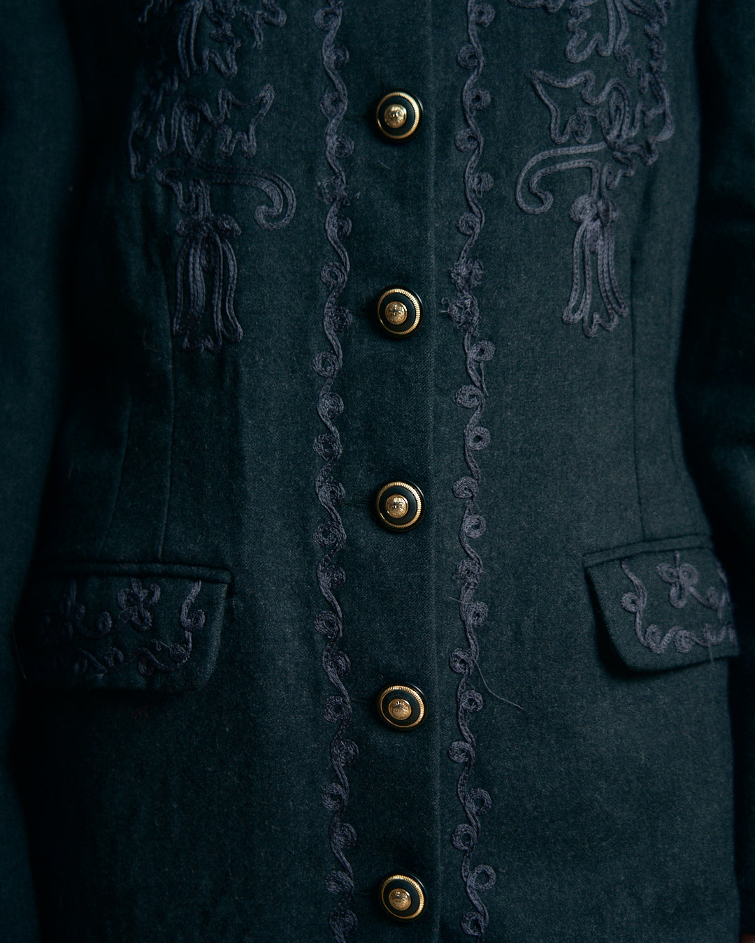 Giacca con collo coreano vintage in lana con ricami a fettuccia e bottoni in metallo
