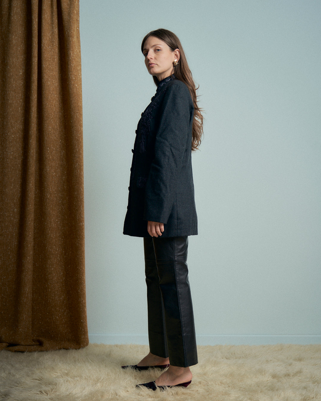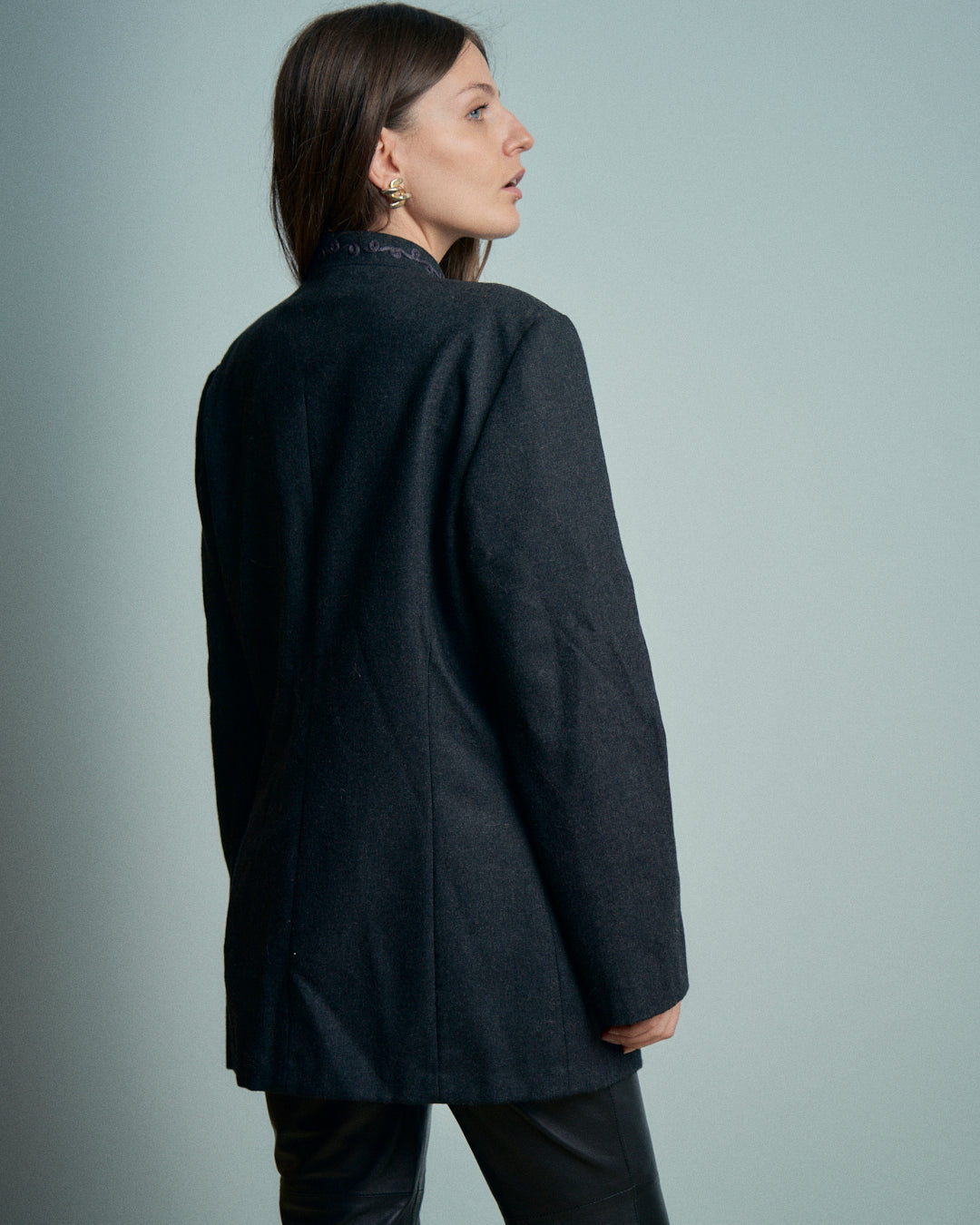 Giacca in lana grigia con ricami collo coreano
