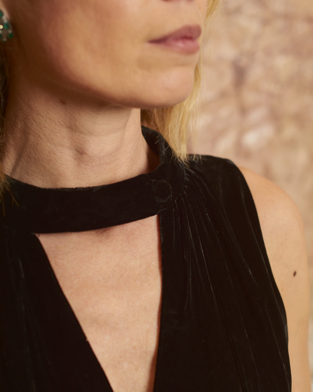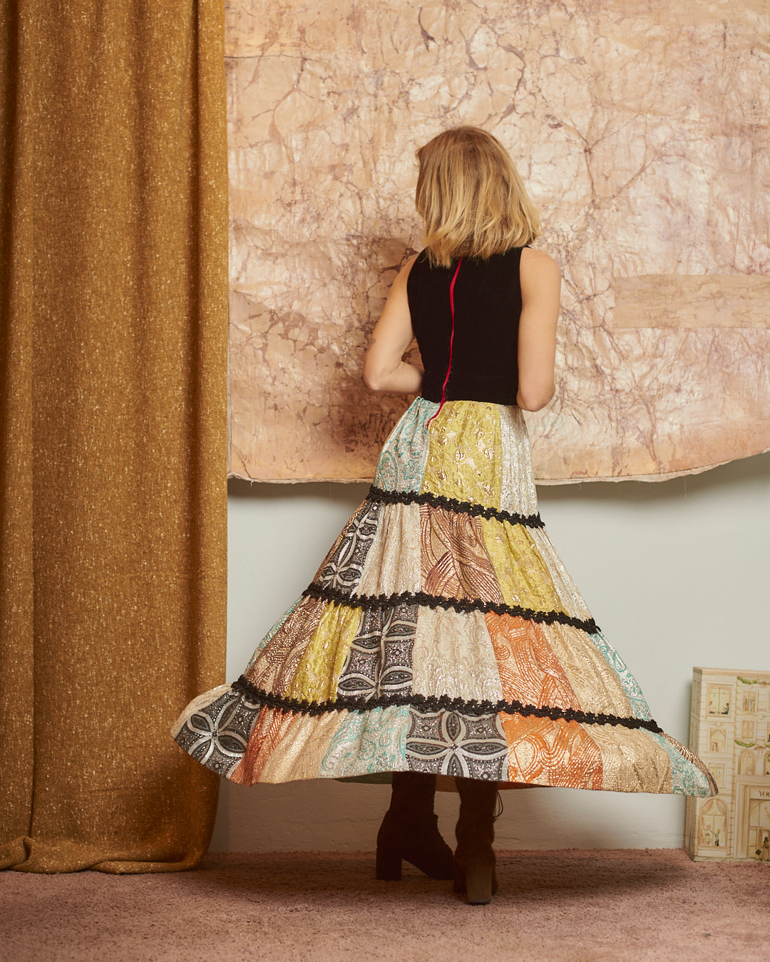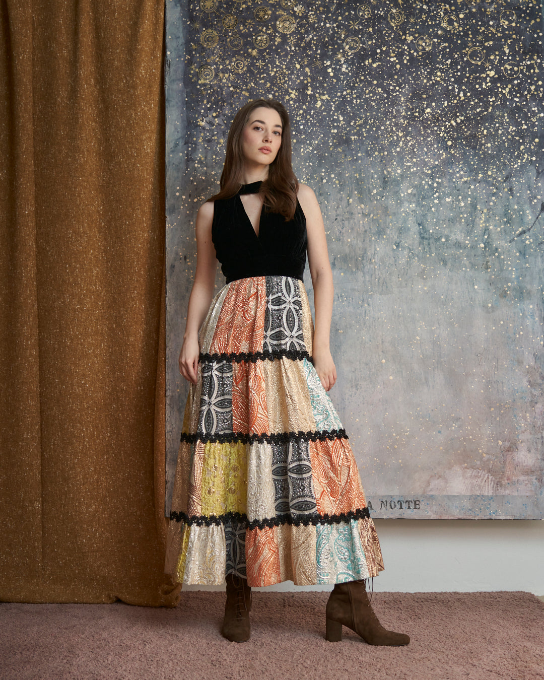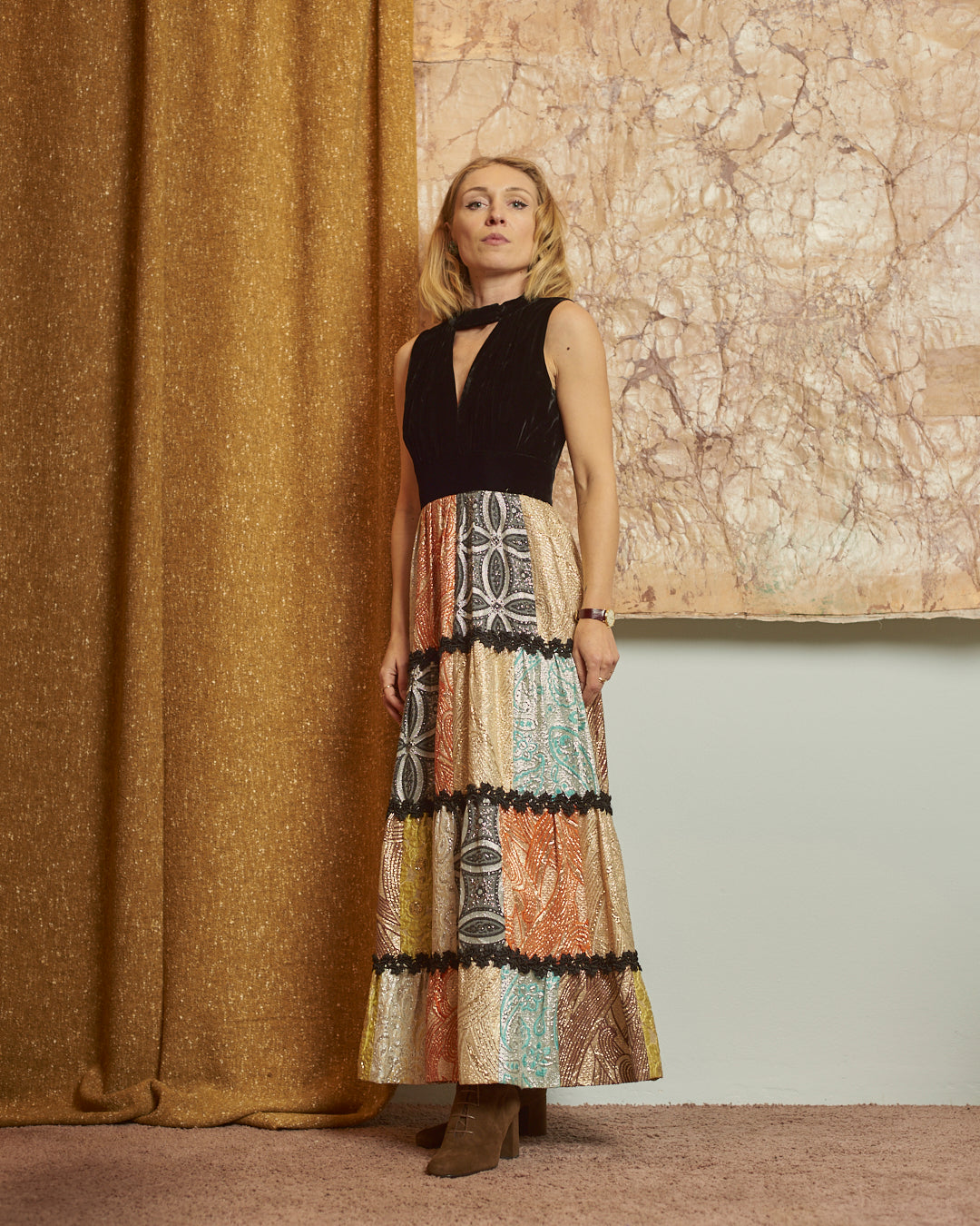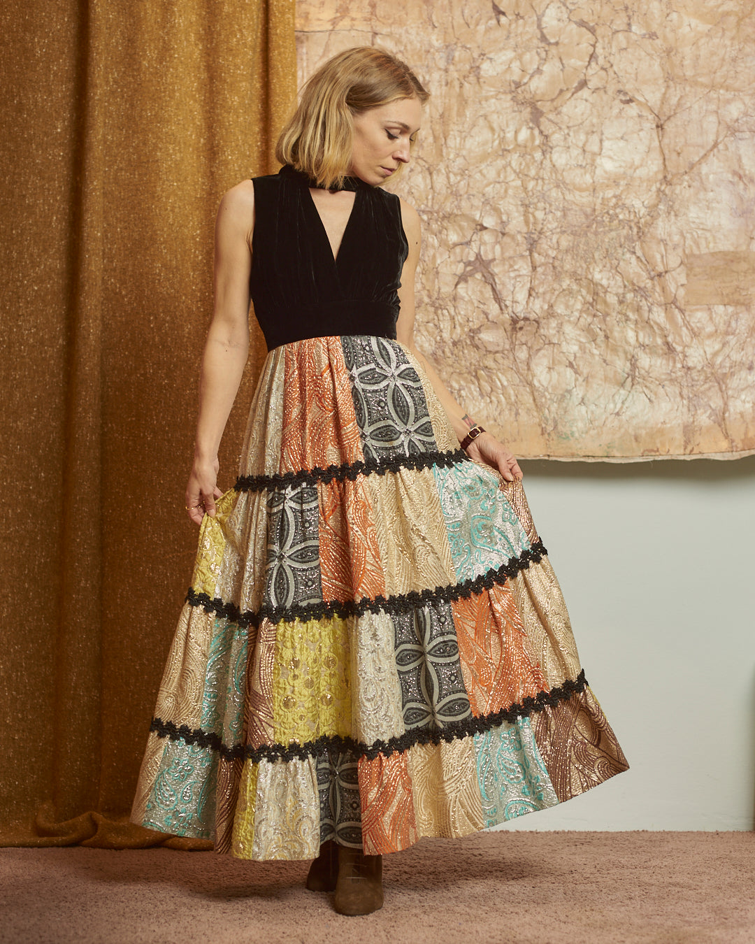 Abito in velluto e balze in broccato anni 70 sartoriale