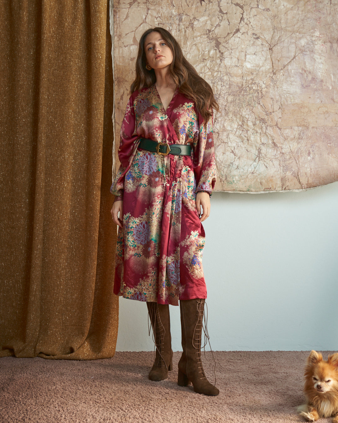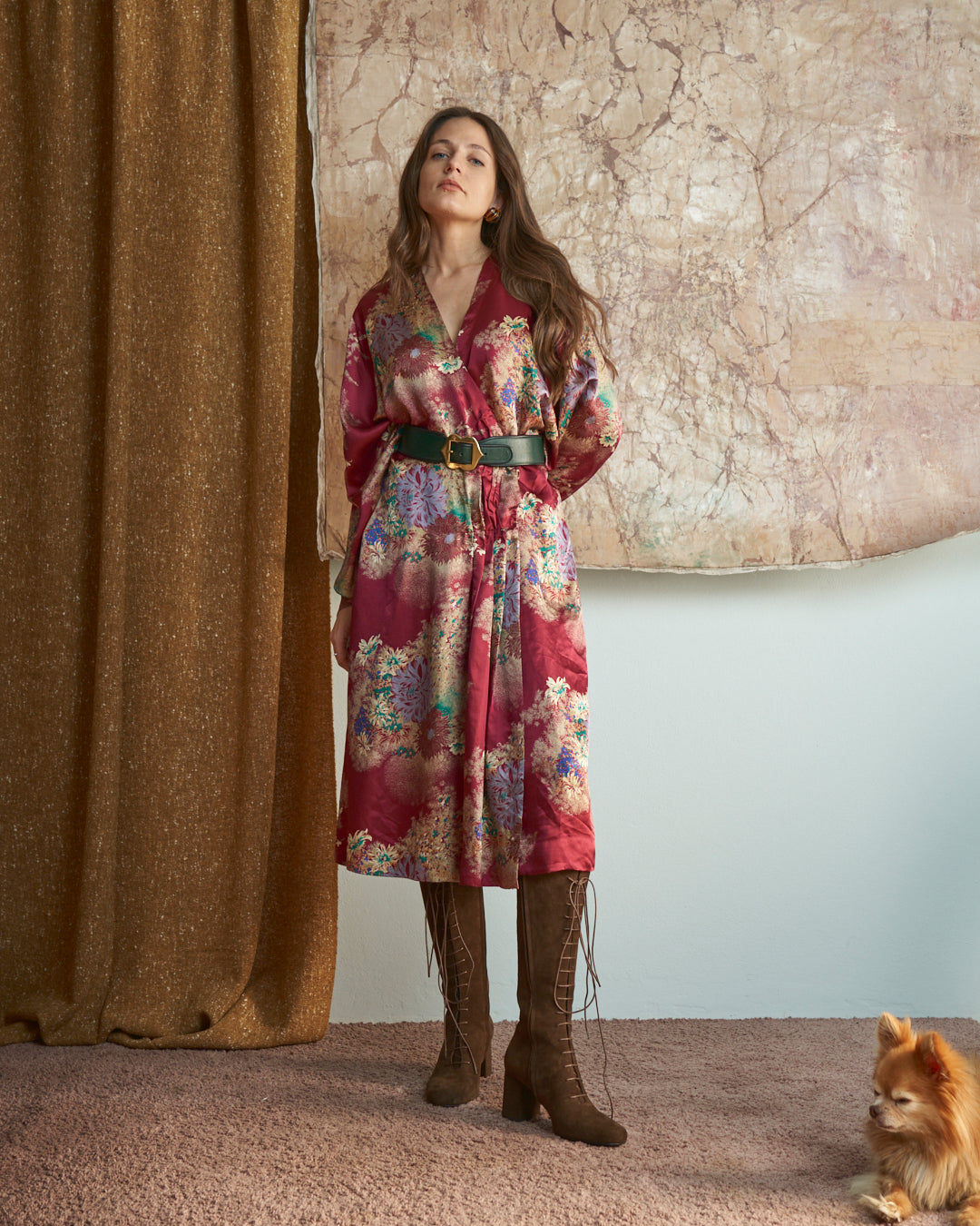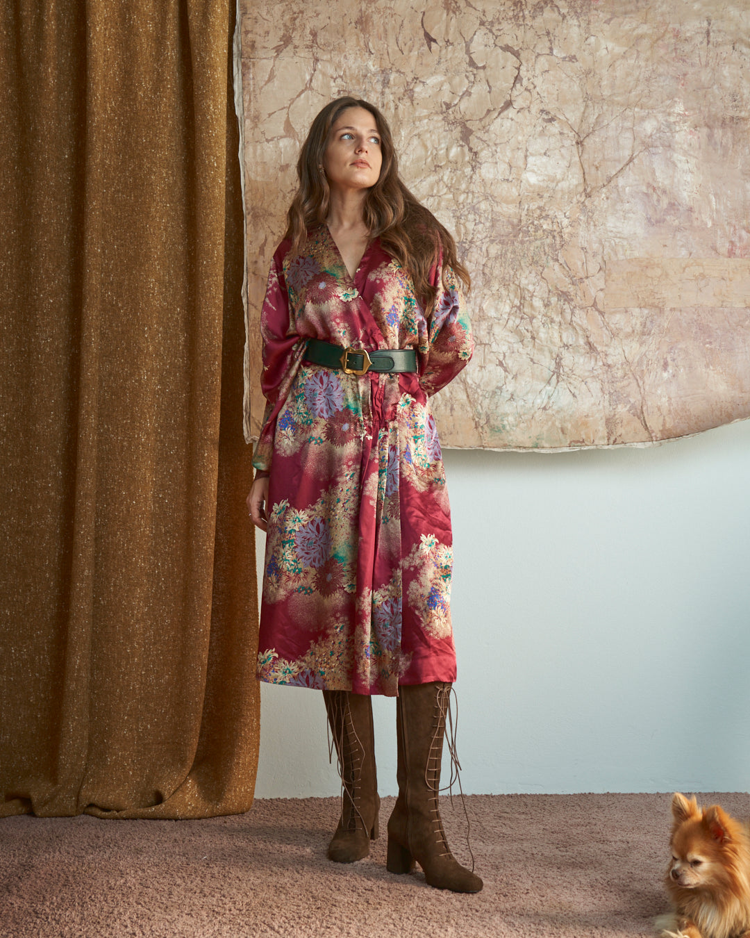 Abito modello incrociato sartoriale in seta con stampa floreale oriente