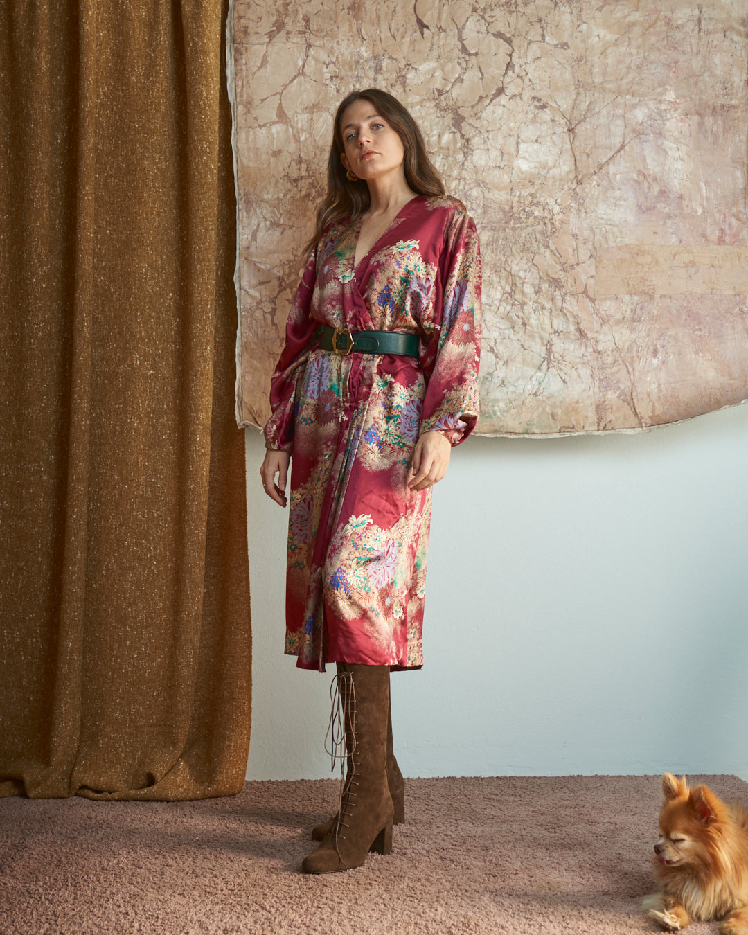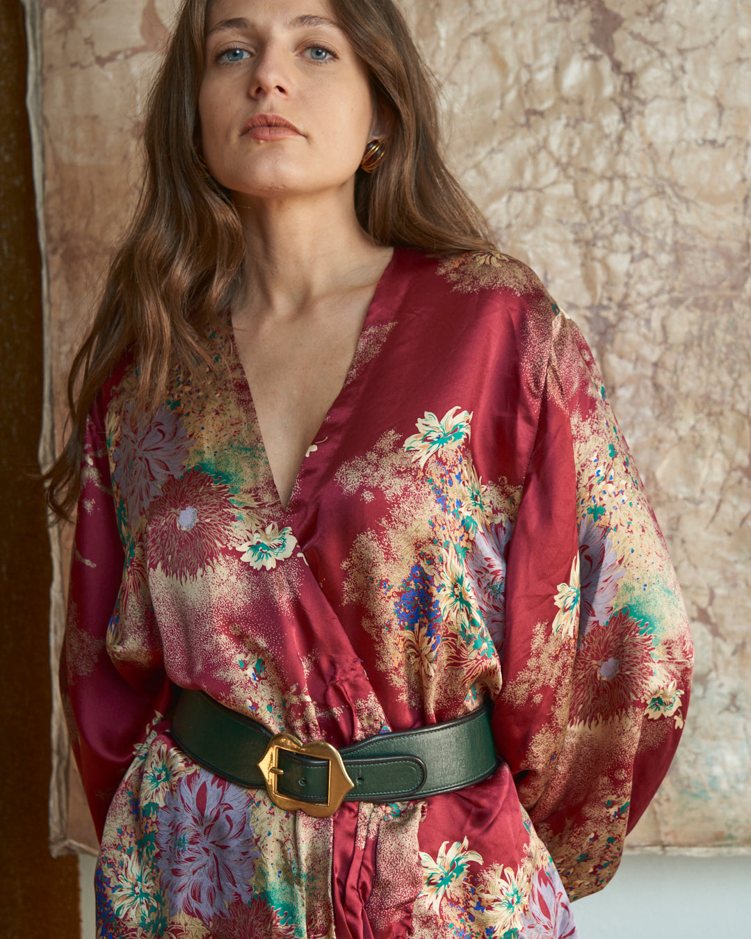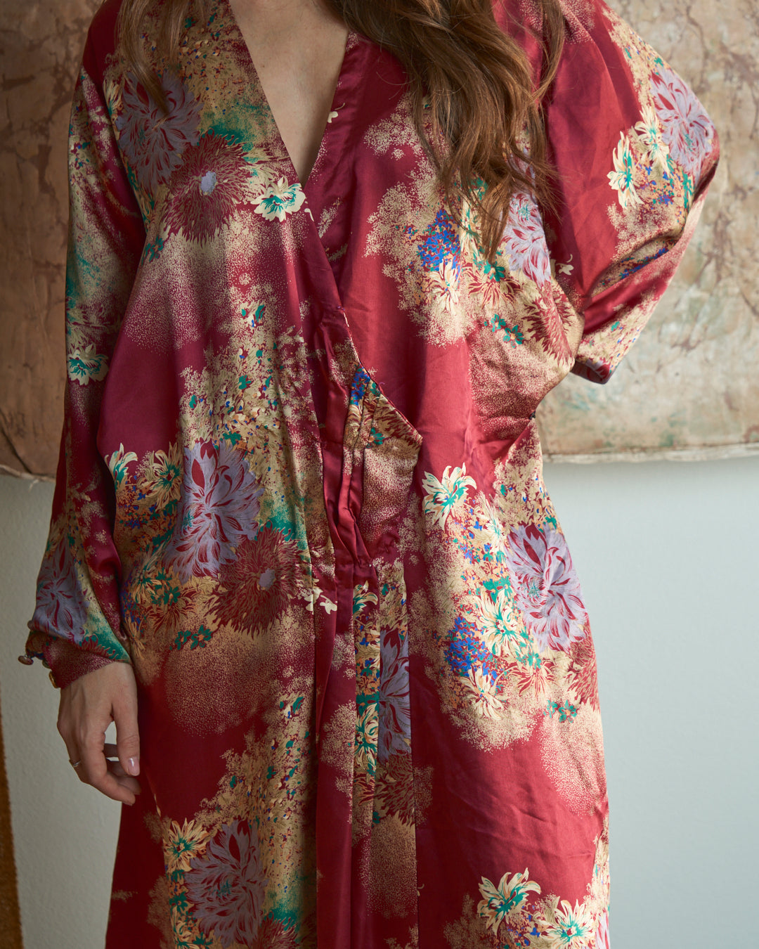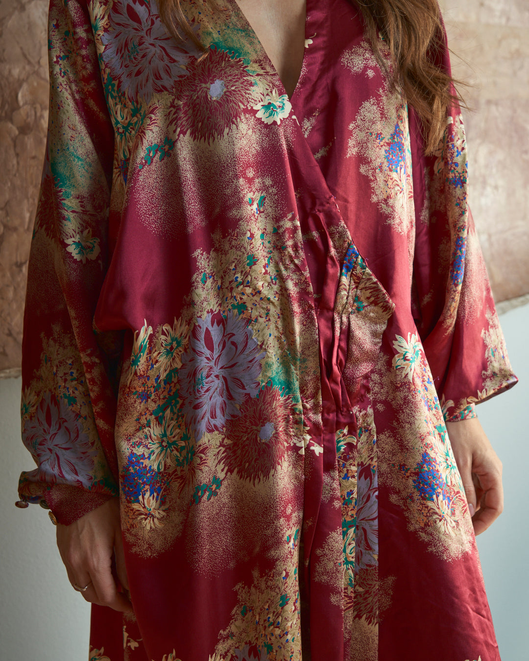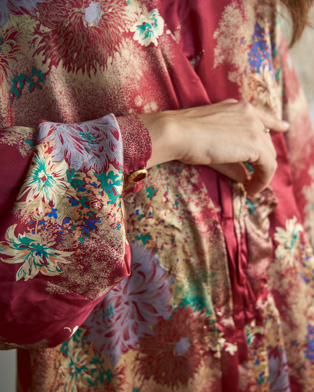 Capo sartoriale in seta pregiata che reinterpreta l'estetica del kimono tradizionale attraverso una silhouette incrociata contemporanea. La stampa floreale orientale dialoga con la fluidità del tessuto