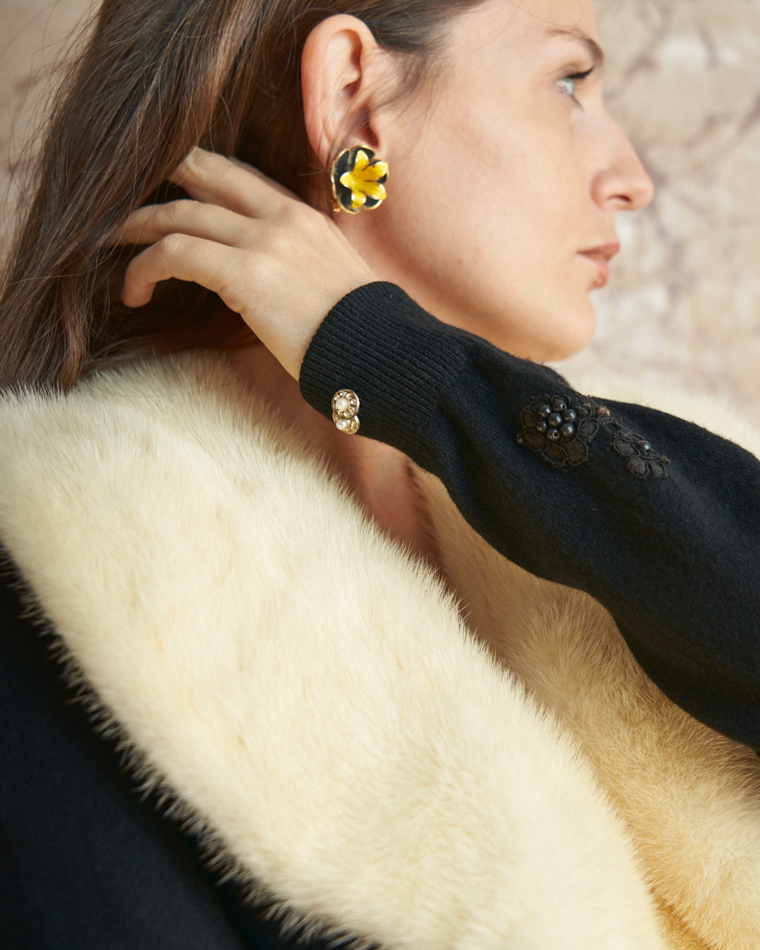 Ricami e pizzi applicati tono su tono, collo in pelliccia beige chiaro burro.