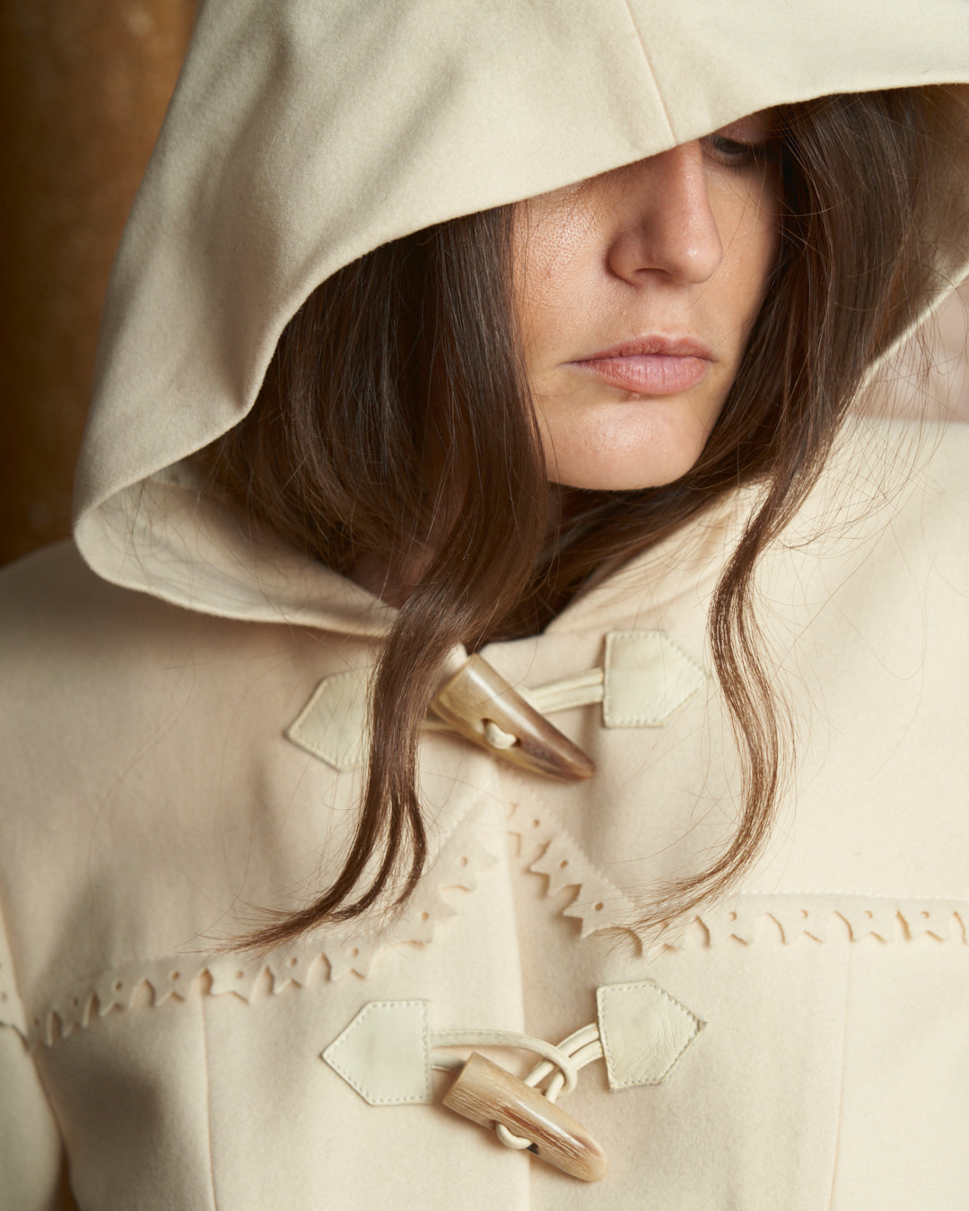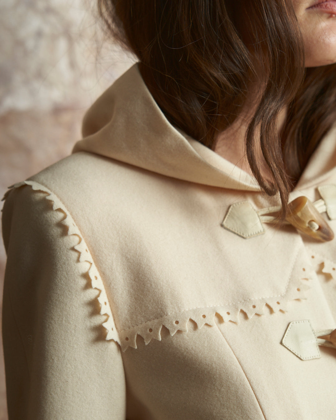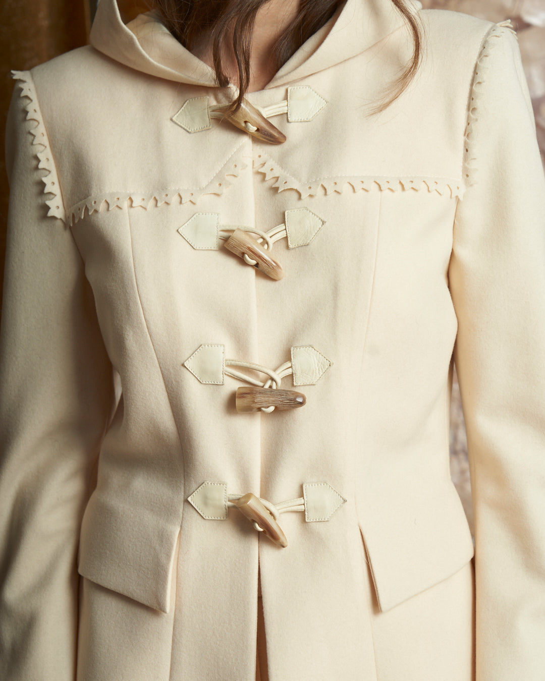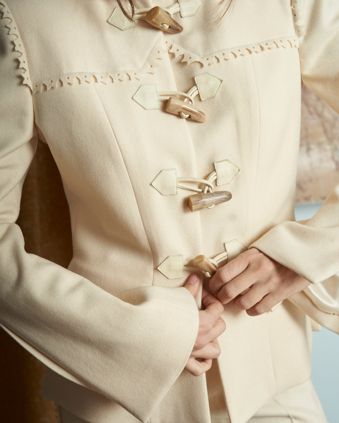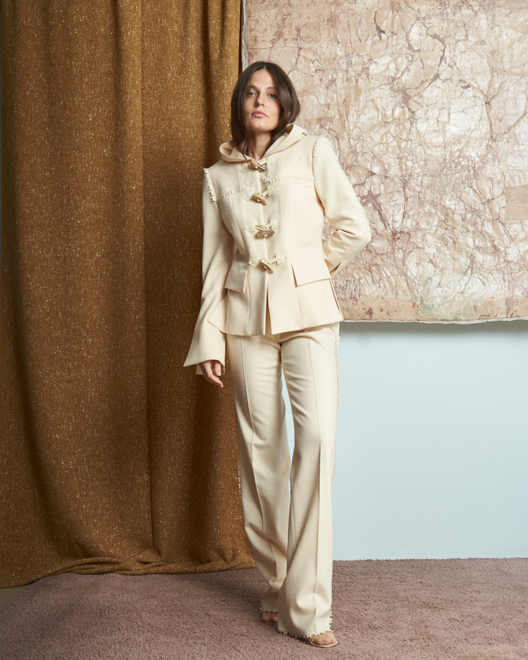 Completo Antonio Berardi della collezione Autunno/Inverno 1999/2000, un'interpretazione sofisticata dell'estetica medievale reinterpretata attraverso una lente punk. La giacca presenta alamari decorativi e cappuccio strutturato, mentre i bordi sono rifiniti con precisione laser per un dettaglio contemporaneo. I pantaloni dal taglio dritto sono caratterizzati da profili laser che enfatizzano le linee.