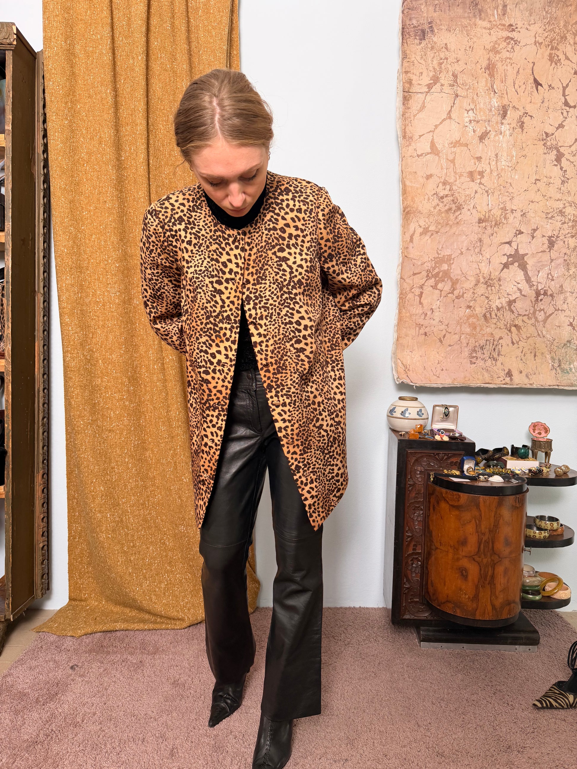 Giacca girocollo leopardata in lana lunga